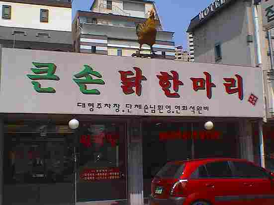 2007年8月19日~9月2日訪韓中に必ず食べる「タッハンマリ」いつも東大門市場にある「チンハルメ・ウォンジョタッポングァン」に行くが今回「おんじぇさん」「プー吉さん」に教えてもらったお店へ行ったヨン今日は「おんじぇさん」に教えてもらったお店「クンソンタッカンマリ」を紹介しま~す地下鉄2号線「新川駅」4番口から歩いて3分くらいにあるでぇ~屋根に登ってる鶏ちゃんが「コッキョクークーコーコ~」と迎えてくれるぅ~けっして「コケコッコー」とは鳴かない「タッハン(カン)マリ(鶏一羽鍋)」「タッハンマリ屋」さんでは珍しく、おかずも出るっちゃ~ね具沢山でウレピぃ~~\(^-^)/「ニラ」と一緒に食べるニダチンハルメみたいに鍋が凹んでなくて料亭で食べる「すき焼き」の鍋のように(食べた事ないけど)超お高級お鍋みたいやったわ*英語&韓国語を楽しく紹介しているブログです* 中国語・スペイン語・フランス語もあるよ~♪マジで笑って身につく英会話&ヨン様もびっくりキムチ韓国語