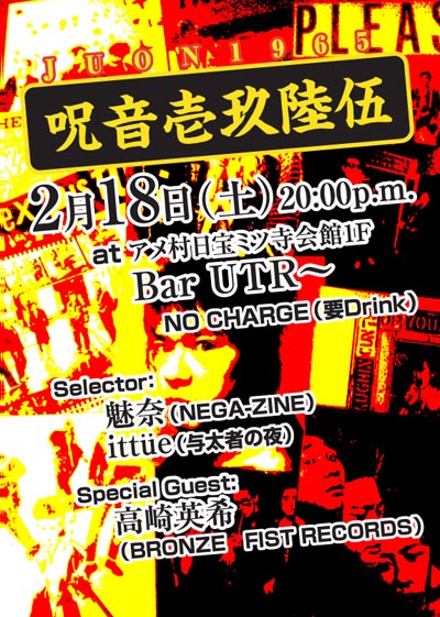 2月18日、BAR UTRでの『呪音1965』、かなり盛り上がりました。一緒にやらせてもらったITTUEさんは、セレクター(DJ)として80年代から活躍し、伝説のクラブイベント『与太者の夜』等を主催していた人。高崎さんはパンク/ハードコア/スキンヘッズのレコード&CDレーベルBRONZE FIST RECORDSを主催し、いろんなバンドでドラムを叩いている人です。両人ともそういう方々なんで、予想通り、かっこいい!シブイ!熱い選曲でパンクを中心に、スキンズやOi!から、日本のロックがとびかう楽しい夜になりました。僕はもう1980年ぐらいの日本の有名どころのロックしかかけないという特殊系で……(苦笑)個人的にひさしぶりの再会があったりして楽しかった!でも……けっこう盛況で、カクテルなんか頼んだらお酒つくるの時間とらせて悪いかなと思って焼酎ばっか飲んでたらまわってしまって………最終的に写真のようになってしまいました!!高崎さんとHang君にタクシーで家まで送還してもらいました…反省。3月19日に同じくBAR UTRで第2回目の、DJイベントをやらせてもらうことになりました。ittueさん、高崎さん、それとittueさんの相棒である恭介さん(KANG-PING-TANG)も参加してくださる予定です。