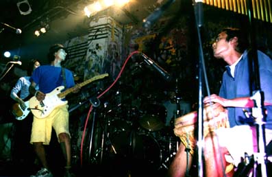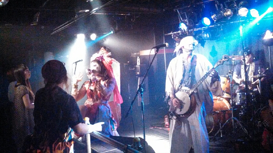 東京の霞鳥弦樂団のライブをみにいってきました。三味線、バンジョー、アコーディオン入りの白塗り7人組。CDに「東西南北中央折衷」とあるとおり、日本の民族的、お祭り的なビートに、沖縄やアイリッシュ風も感じさせる。かなり個性的なメンバーで歌あり笑いありで、楽しいライヴでした!ベースの内田さんがAgent murderにいた方で、昔、新世界ブリッジでタイバンさせていただいたこと、エレベーターで機材運ぶとき一緒だったことおたがいに覚えてて。さらに物販の女性も当時の人で、思いがけず昔話ができて嬉しかったです。ボーカルの鞠さんはmixiで10年ぐらい前につながってていろいろやってらっしゃるの拝見してたのでお会いできてうれしかった!