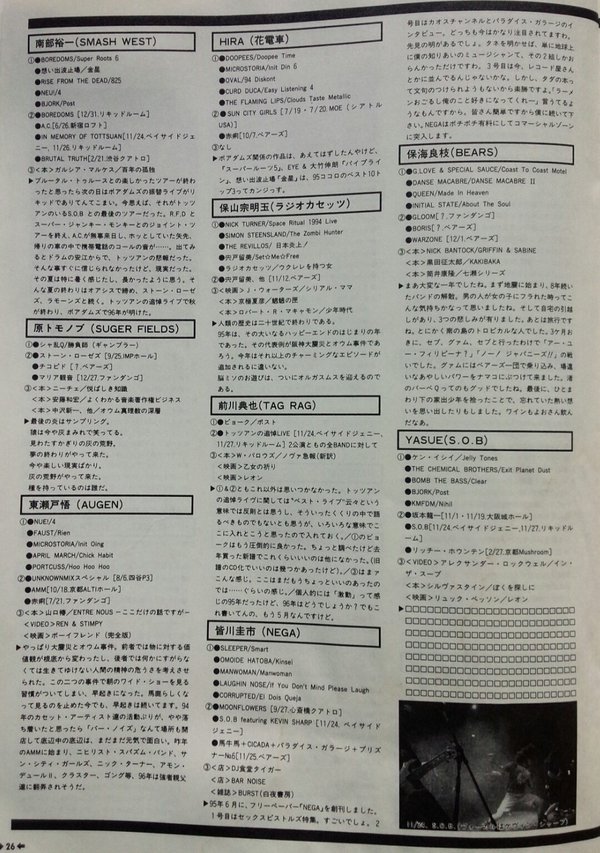 20年前、雑誌「G−SCOPE』を発行されていたガンジー石原さんからFAX が届きました。「関西CORE 人が選ぶ1995年ベストアルバム」という、毎年、いろんな関西オルタナの有名な方がその年のベストアルバム、ベストライヴ、その他をセレクトするコーナーに、ぼくの回答も掲載してくださるとのこと。それは、まだフリーペーパーを出して間もないペーペーのぼくにとって本当にありがたいこといでした。仕事から帰ってFAXを見た時、うれしくて舞い上がってしまったのを思い出します。twitter でそのページをスキャンして掲載してる方がいて、大変懐かしく、読み返しました。自分では忘れていたのですが、みてみると・・ベストアルバムにはSLEEPER/SMARTOMOIDE HATOBA/KinseiMANWOMAN/ManwomanLAUGHIN NOSE/If you don’t mind please laughCorrupted/ El Dios Quejaを選んでいました。一番上のSleeperはUKのBrit pop のバンドで、G−scope には関西のハードコアやアングラなバンドが載っていたので、完全な場違いな選択だったんですが、当時ぼくはUKインディーが好きで、このデビューアルバムも本当に良かったんで、あえて歩み寄らず、しかも一番上に入れてみた・・・つもりだったんではないかと思います。その他、想い出波止場は山本さん、津山さん、chewさんのラインアップですごかった時期だし、金星はその最後の方で、なんともいえないすごい世界に向かってて本当すごいなあと。MANWOMAN は、その頃東京の人とFAX で情報やりとりしてて、MANWOMAN とかBORISがガンガンやってる頃でいろいろ知っていく中で、ぼくも東京にライヴみにいったりしてまして。MANWOMANのこのZKから10インチがタイムボムでもすごいプッシュされてて、聴いてみたらすごいよかった!ラフィンは、ずっと解散しててチャーミーさんがどうしてるのかもわからない状態だったけど、ポンさんが戻ってワンタンさんとベレーさんが入って、でたこのアルバムがすごい良かって。名作ですよね。で、ラフィンも当時の空気からしたら、G-SCOPE とか載りそうになかったし、それもわかってるんですけど、あえて選ばせていただいた。CRRUPTED はやっぱり誰が聴いてもすごかったし、これはTag Rag から出た1stでしょう。こんな遅い重いバンド、初めてやったから。その後の影響とか考えたらやっぱり画期的なことでしたよね。というわけで・・アルバムに関しては、2015年のぼくからみても異議がないと思います。LIVEは95年はまだ、そんなにいろいろみてたわけではないはずなんですけど、、むしろ外国のバンドの来日は月2、3本きてましたね。MOON FLOWERS っていうのはイギリスの、コミューンで集団生活してるようなサイケヒッピーバンドで。でも音楽はすごくて、フリージャズみたいな感じで。感動しましたね。SxOxB はトッツァンが亡くなった追悼イベントのやつですね。すごいイベントでしたね。あとはダンスマカブラとか印象に残ってます。。あと、二階から一階で修羅さんが暴れてらっしゃるのをみてた記憶があります(笑)馬牛馬、CICADA 、パラダイスガラージ、プリズナーNo6 っていうのは、その頃、パラガの豊田くんや亡くなった弓場宗治さんの導きで、その周辺のライブや人脈に入らせていただいて、尾崎伸行さんとか松本亀吉さんとか、岡山の人たちとか。バーノイズのカナミくんとか、チコピドくんとか、怖とか身長2mとかもこういう方から知り合っていけたんですね・・。このライブもよかったですね、細かいことは覚えてないけど・・。あんまり今の人たちに記憶されていないというか評価されていないのが残念ですが・・。あと、その他でBAR NOISE 、DJ 食堂タイガー。これは両方ともバーだったんですけど、バーノイズは言わなくてもみんな知ってると思います(笑)タイガーっていうのはワンワンズとかにいた(らしい)ウンテン君って人がやっていた店で。2回ぐらいイッチュウさんがイベントしてDJ やってハードコアやらパンクかけて盛り上がったんです。ウンテン君はそのあと、会ってないけどどうしてるのかなあ・・今あってもわからないなあ。それから、創刊されたばかりのBURST を選んでますね。まだ自分が書くようになるとは思ってなかったですけどね。最初買ったときに、すごい面白い雑誌がでてきたなあと。ただ時代にまったくあってない!と感じましたね。そんな時代じゃなかったから。今の方がむしろBURST需要ありそうですけど。ギズムとかアナーキーとか載ってて。時代的にそういうのをまったく求められていない時代だったから。いきなり昭和に戻っていった。かといって今ある昭和ノスタルジーではなくて。ぼくにはその感じが良かった。最後のほうのコメントなんですが、恥ずかしい限りです。謙虚に書くっていうのができなかったんでしょうね・・張り切っていたし、ずっとロッカーに憧れて。そういう人の発言に影響されてて。そのあとの人生で、本当どん底に落ちたり、悲しい名にあったりして、己を知った今なら、もっともっと謙虚なコメントを書くんですけどね。コレ
