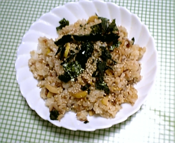 今日のお昼ご飯に作った豚肉とたけのこのチャーハン風です。たけのこはハチク竹が出てきたので それを使いました。作り方を載せておきます。<材料>豚バラ肉100g 竹の子100g しょうが一かけ いりゴマ適宜 味付け海苔<調味料>出汁の素小さじ1、醤油大さじ2、砂糖大さじ1、みりん大さじ1、ウェイパー小さじ1<作り方>中華鍋を熱してサラダオイル大さじ1を入れ 豚バラ肉を炒める。しょうが、たけのこも入れる。火が入ったら調味料を入れる。味が付いたらご飯を入れ炒める。お皿に盛ってからいりゴマと味付け海苔を袋入りの状態でくしゃくゃにしてもみのりにして掛ける。 前に日記で豚肉の混ぜご飯を書きましたが それのチャーハン版です。半分はそのまま食べてもう半分はわさびをのせてお茶漬けにして食べると 二度美味しいですよ。是非作ってみてください。