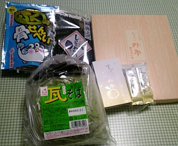 私のブログ友達のがくちんさんの切り番を私が踏む事が出来ました。44444番でした。4が合わさっている しあわせ番です。がくちんさんは私のブログ上でのお姉さん。とても大好きな人です。幸せをいただいた上に 切り番プレゼントまでいただきました。それがこれです。瓦そばとしそわかめ、ういろう、ふぐの骨せんべいです。どれも美味しそうな物ばかりでしょ。ふぐの骨せんべいは私のビールのおつまみにといただいたんですが、もうそろそろ骨粗しょう症の心配をしなければならないのでカルシウムがたっぷりで とても嬉しいです。どの商品も御主人も一緒に何がいいかと考えてくださったもので 申し訳なくて。有難うございました。心からお礼申し上げます。これからもどうぞよろしくお願いします。