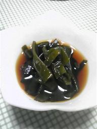 茎若布ってご存知ですか?若布の中心の硬い部分です。おつまみとかお菓子の所で くきわかめ として売られていますね。その加工されてないものが売っていたんです。塩漬けされているものなので 塩抜きしてから使います。作ったのがこれ。見た目は昆布みたいですが 茎若布です。醤油と砂糖、味醂で味付けました。もう一品前に作ったのは さっとゆでて わさびマヨネーズで和えて食べました。茎若布は歯ごたえがあって好きな食材です。もし、茎若布が手に入ったら作ってみてくださいね。