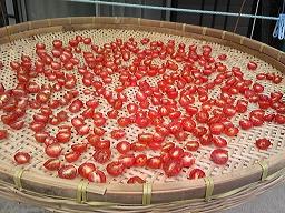 孫達が夏休みになって こちらに来てから もう七月も終わりになりました。Y子のピアノがある水曜日には一時向こうに帰るのですが 終わるとその日に こちらに帰って来ます。あれこれしたい事が進みません。その上 この暑さ!孫達の喧嘩の声は暑さを数倍にしてくれます。たまりません!少々疲れ気味です。昨日はKの幼稚園の地区のお祭りがあり 主人の運転で孫達と嫁 私とで行って来ました。Kは幼稚園から踊りに出たんです。上手に踊っていました。終わって夕食は回転寿司に行きました。主人と私が家に着いたのは9時半でした。明日はY子のプールで嫁も自転車で行く子供の引率当番が当たっているので また 私は子守りに行ってやります。 猿に荒らされた畑ですが 今は猿が違う場所に行ったのか また 胡瓜や茄子 西瓜も一個生りました。プリンスメロンも幾つか採れました。少し落ち着きました。でも この日照りで 野菜も弱り気味。サトイモの葉が枯れだしました。今まで採れた胡瓜が沢山で食べきれないので 塩漬けしておきました。今年漬けた梅干も 三日三晩の土用干しを終えました。今日から食べきれないミニトマトを天日乾燥させています。 結構な数出来そうでしょ!!もうミニトマトの木もいつ枯れてもおかしくない状態なので 作るのが最後になるかもしれません。農協に行った時 一冊の本が目に付きました。面白いので購入しました。 色んな野菜の保存方法が載せられています。食べきれない野菜を乾燥させて 戻して食べるやり方やその他色々載せてあります。残った野菜を腐らせてしまうのは勿体無いですから何とかならないかと 常々思っていたときにこの本と出合って嬉しかったです。保存できても使い方が分からなくてはいけないですから この本でしっかりと勉強します。 今までコメントにお返事できなくてごめんなさい。m(__)m今からお返事させていただきますから よければご覧くださいね。