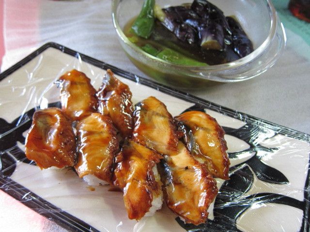 無性に食べたくなり本日の昼飲み(宅飲み)肴はうなぎの握り茄子とピーマンの揚げびたし自家製?焼き鳥(塩)自分で串に刺しましたモモ肉とささ身niaにもささみをおすそわけ