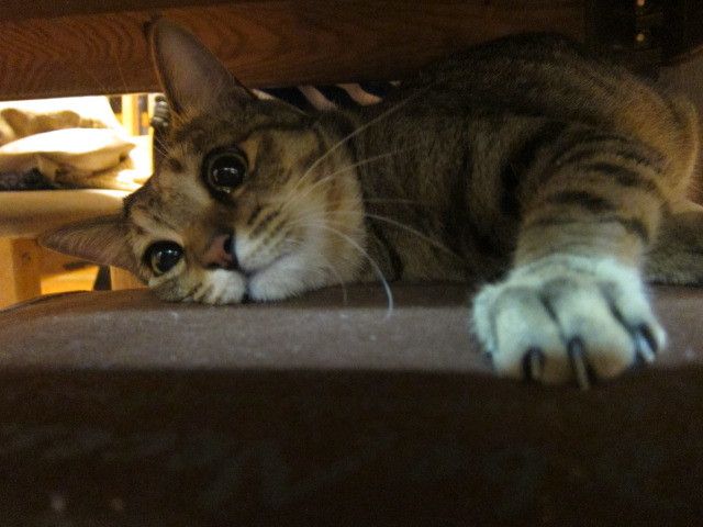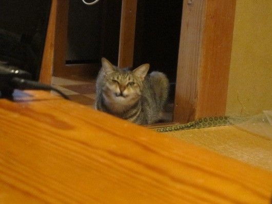 キッチンに居たはずのniaがいなーいどこだ。どこだ。テーブルと椅子の間。こんなところに居ましたよせまっ君は狭いところ好きだよね閉所恐怖症気味の私はちょっと怖いだよ