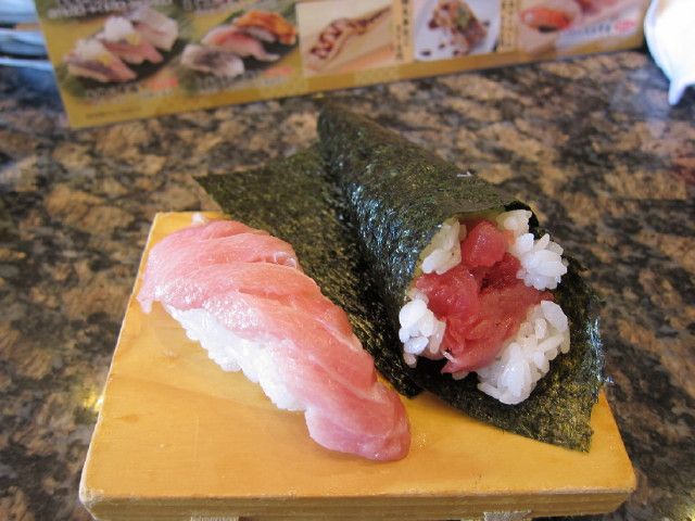 以前よく行っていた板橋区の回転寿司マグロ解体ショーの後はなかおち手巻きが無料サービスなのよそして店員さんとのじゃんけんに勝つと希少部位の握りがもらえるこの時はじゃんけんに勝ってカマトロもらった店員さんが元気で活気があって酒の肴になる一品料理も美味しいのだniaは何故か刺身のまぐろを食べないのよねサーモンやカツオは少しだけ食べるけれどあまり好きではないみたい魚 <<< 肉なのね