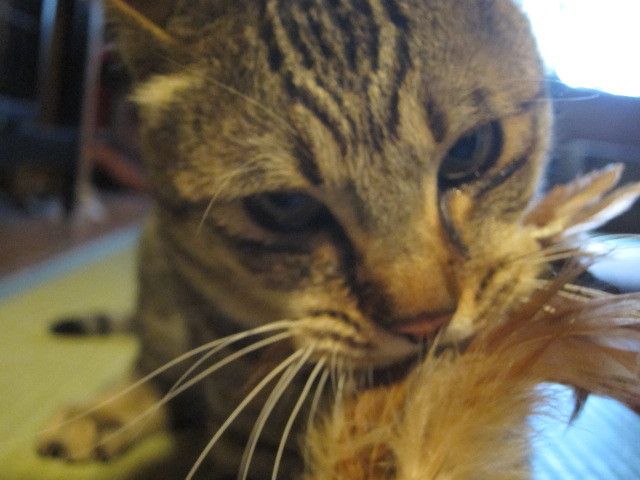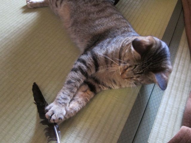 家の前に落っこちていたカラスの羽一応熱湯消毒して天日干ししてniaにあげたさすが天然物。喰いつきかたが違う噛み砕く勢いだったので羽を取り上げて隠したらにゃぁぁんってすっごい可愛い声で鳴くのあぁーん。返してくださいにゃぁって感じ本物の孔雀の羽とか欲しいなどこで入手できるのだろうか