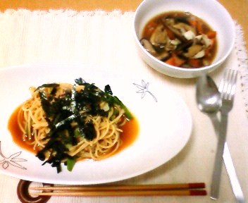 今日は残り物料理でパスタを作りました。昨晩作った「けんちん汁」と「小松菜の和風パスタ」です。低カロリーを目指しているんですけど、これってカロリーどうなんでしょうね。運動うしてないから身体がたるんでたるんで・・。怖いです。