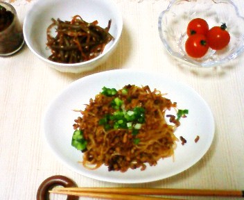 今日は「しらたき」を使った料理です。しらたきって本当に低カロリーで料理もしやすくダイエットにぴったり。倍食べてボリューム出して、他のものを食べなければ結構いい感じじゃないかと思います。今日は健康的に「しらたきと鶏そぼろ炒め」「きんぴらごぼう」と「ミニトマト」にしました。あんまり「おなかいっぱい!」って感じにはなりませんけど。美味しかったです。