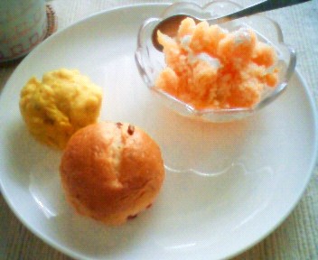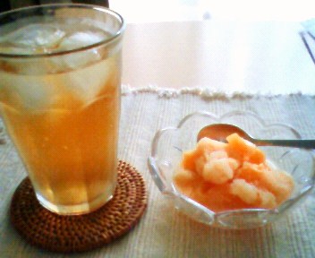 実家から送ってもらったメロン。大きなメロンがごろんと転がっていたのですが、そろそろ食べごろと思って冷蔵庫で冷やしていたものを朝食にそのまま頂くことにしました。が、いくらなんでもひとりで丸ごと1個は多い。でも食べないと悪くなってしまうしと思って、半分はシャーベットにしました。作り方はとっても簡単で、メロンを簡単に潰し、お砂糖と牛乳(今回はなかったのでヨーグルト)を混ぜて冷凍庫へ。何度かもみほぐして食べる時にはもう1度もんで器へ。とっても色も綺麗で美味しそうでしょ?味もGOODでした。日持ちしない気がするので明日頑張って食べることにします。 晩ごはんはダイエットにと思い、麺類にしているところをしらたきに変えて「しらたきと納豆と卵」を混ぜて揉み海苔を掛けて頂きました。お腹いっぱいになるしとっても美味しいです。