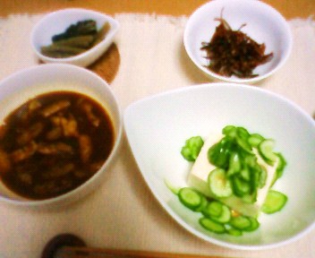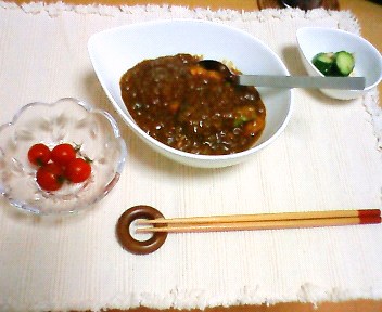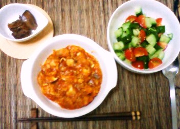 今日は「鶏肉のカチャトラ」と「きゅうりとトマトのサラダ」「鶏レバーの佃煮」を食べました。なんか変な組み合わせですけど(笑)。お弁当にもって行きやすい料理を作り置きすることが多いので、日持ちのする料理が多くなるんですよね。トマトの赤ときゅうりの緑がとっても綺麗だなーと思いました。