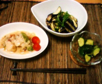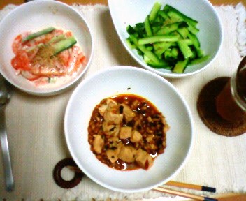 今日は残り物ご飯でした。きゅうりとトマトをそれぞれ簡単に料理し、作り置きしてあった麻婆納豆を解凍して晩ごはんです。きゅうりはにんにくと一緒に炒め、トマトはマヨネーズと和えて簡単なサラダを作りました。暑い季節、ちょっと工夫すると食も進んで夏バテ防止バッチリですね。