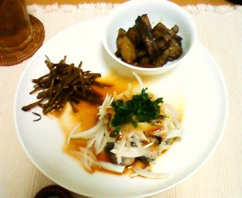 自宅へ戻りました。やっぱり冷蔵庫に入っている食材の量が違います。とにかく食べきれる量しか買わないし、無駄にしないようにしようと思うので、大量買い、まとめ買いしている実家とは違うのは当然ですが。何もなかったのでとりあえずさばの水煮缶詰を利用し「缶詰と玉ねぎのマリネ」を作り、オフクロの味を求めて(?)きんぴらゴボウを作りました。ワンプレート風に盛り付け気持ちだけ明るく(笑)。