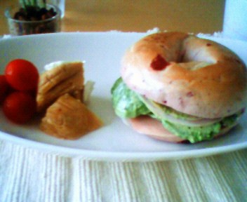 昨日の料理に使ったアボガドの半分を使って、今日はアボガドサンドイッチを作りました。よく考えたらすごいハイカロリーな食べ物ですよね。アボガド1/2とハムとベーグルって500キロカロリー超えてそう・・。 晩ごはんはお豆腐と納豆にします(>_<)。