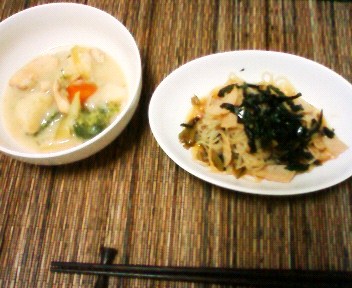明日から仕事かと思うと気が重い連休最後の日。作り置きしてあった「ホワイトシチュー」と「高菜のスパゲティ」を「しらたき」に変えて作りました。しらたきって驚くほどカロリー低いので、シチューとパスタではカロリーが高くなりすぎますが、しらたきだとぐっと抑えられていい感じです。ちょっとお腹すく感じはしますけど。とにかくデニムが苦しくなってしまい、ここに書いていない日がたいてい飲みに行っているので、あり得ないカロリーを摂取してしまっており、大変なんです・・・。あぁ、もとに戻りたい。
