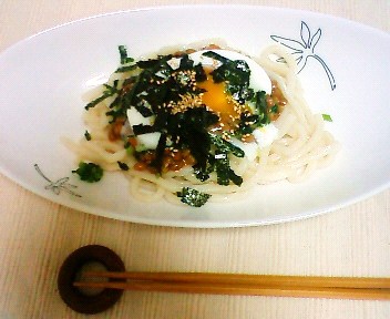 今日は昨日作ったカレーを食べるか、違うものにするか若干迷いつつ「中華風納豆とタマゴかけうどん」にしました。納豆と辛味噌、ごま油等を混ぜ、冷やしたうどんの上に掛け、温泉卵を乗せるという簡単なものです(笑)。簡単ですが、暑い日にはぴったりの料理でさっぱりしていて美味しいです。ものすごく早く出来上がるし。美味しかったです。
