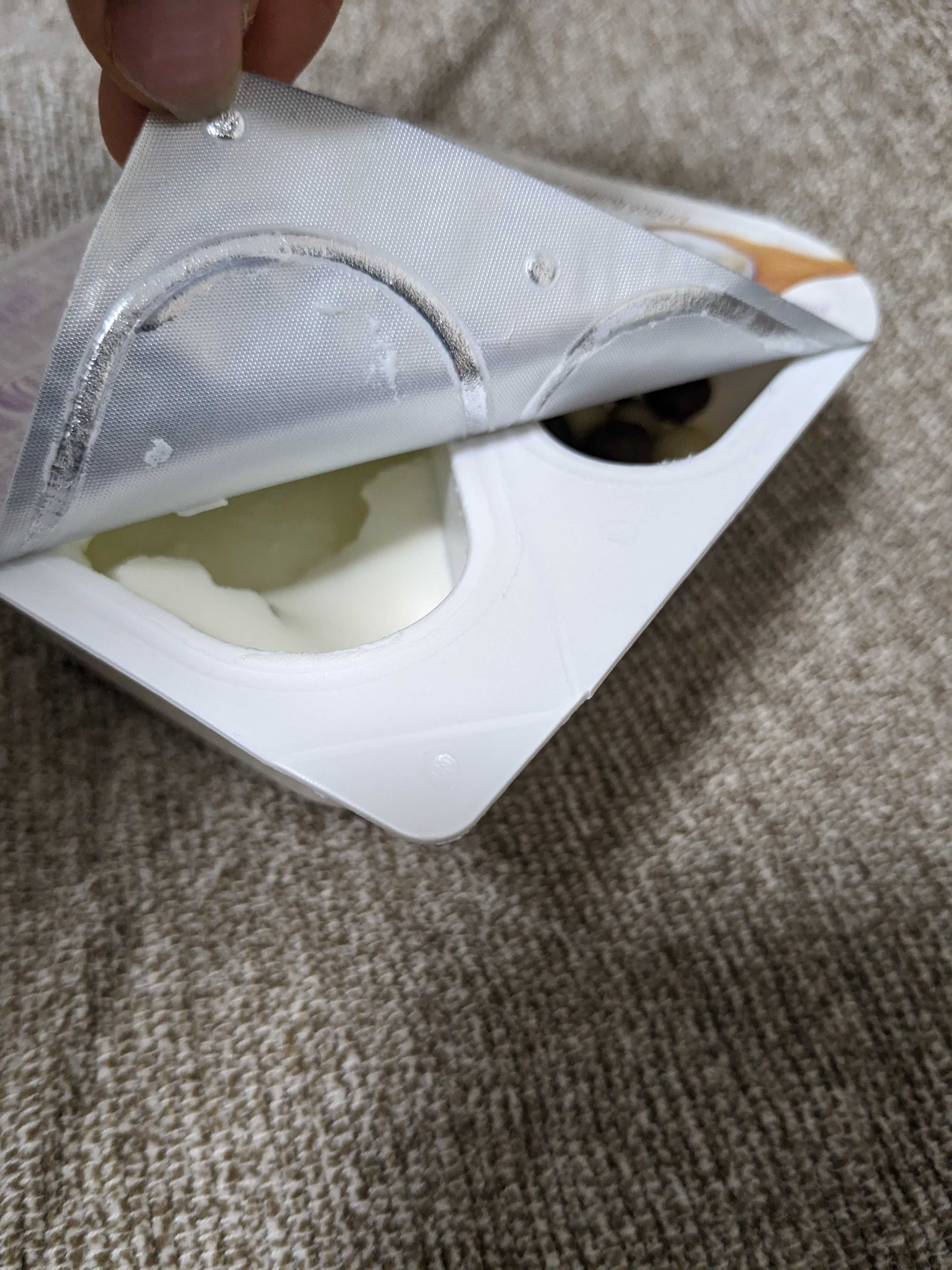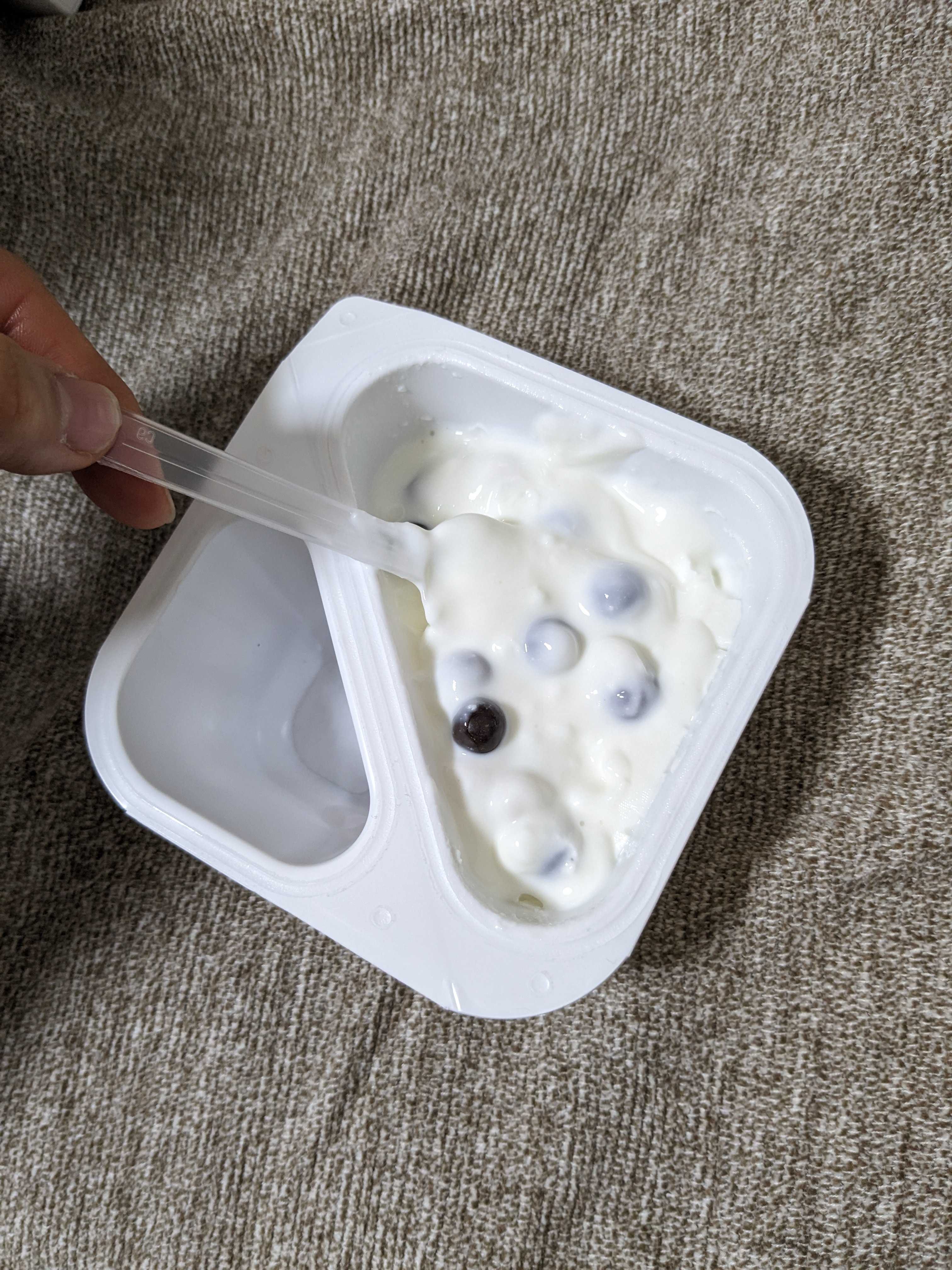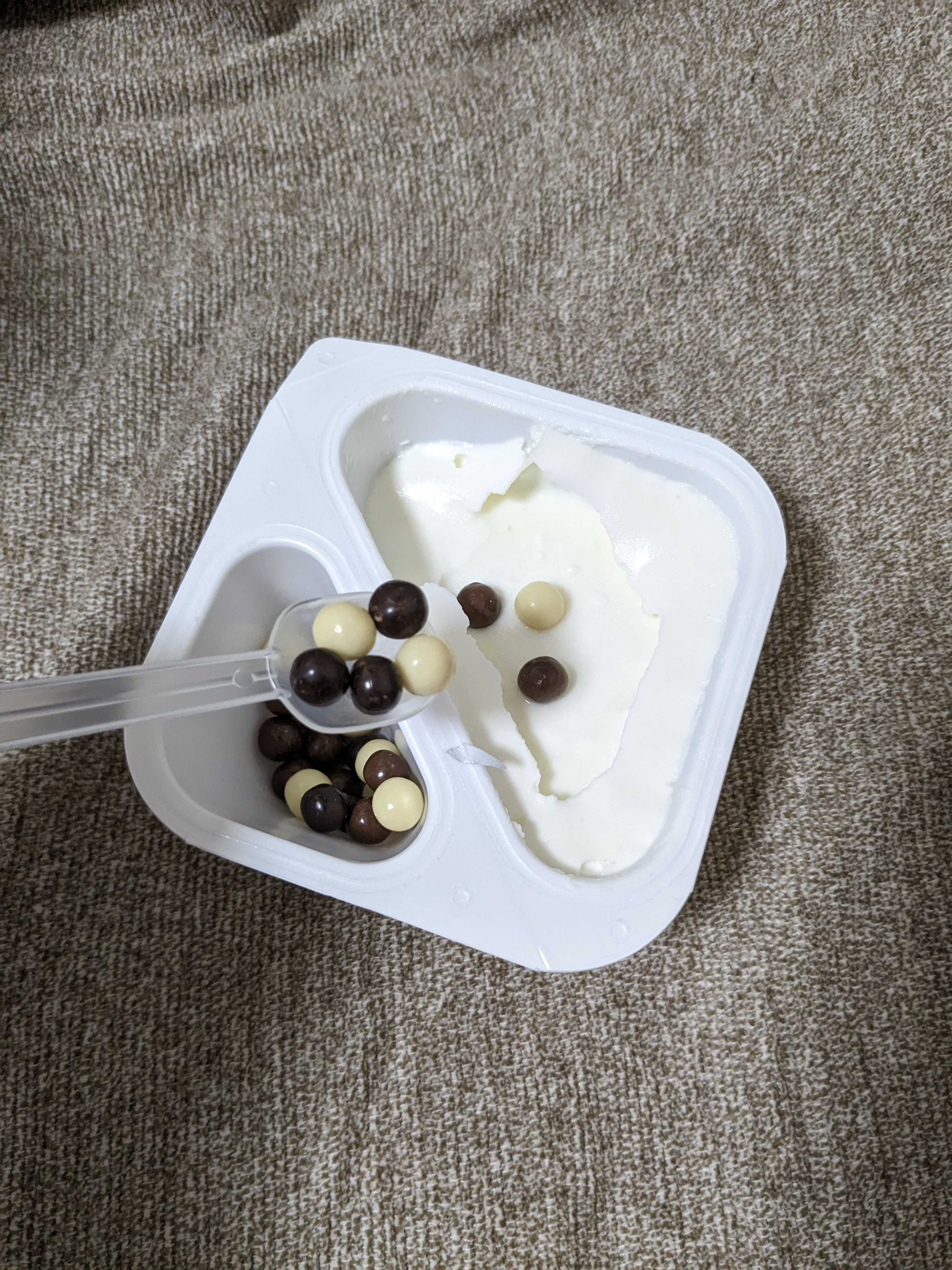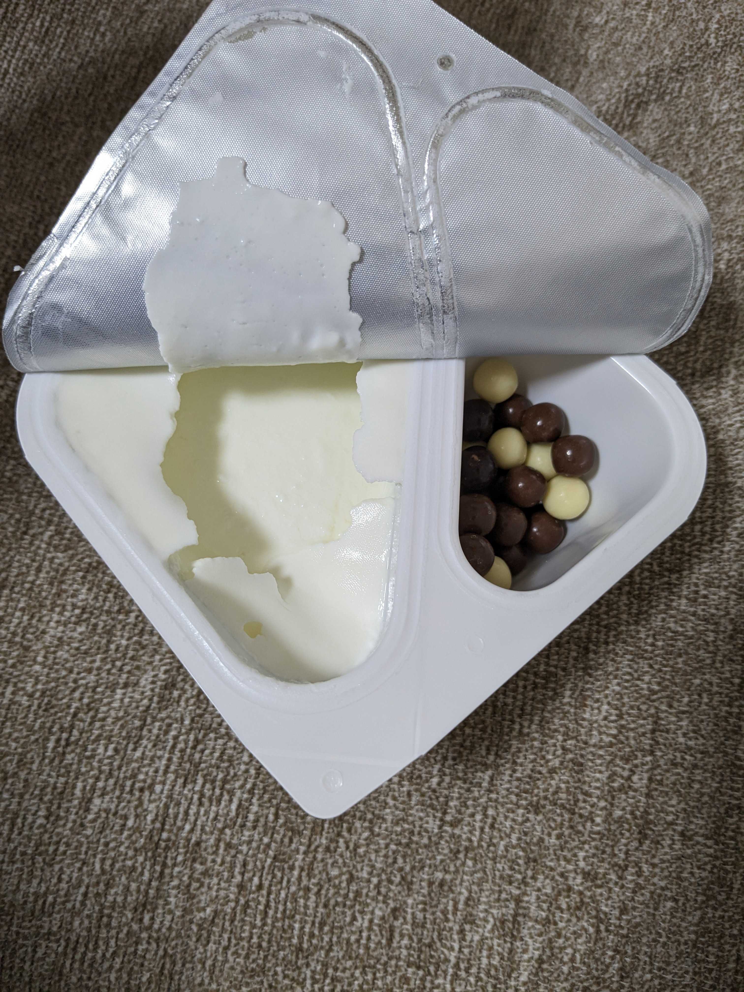ヨーグルトが左側、そして右側にチョコレートお菓子が入っています。日本にはこの斬新な食べ物ある!?ないですよねー!?