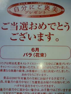 みなさん こんばんは!【実るほど 頭を垂れる 稲穂かな】・・・博学をひけらかす、みん★みんです。先日、ワタクシ宛のハガキが一枚届きましたまた、スッポンエキスのDMかぁコルァ~←どこから住所が漏れたのかナゼに私がスッポンエキスまた、結婚相談所のDMかぁコルァ~←もう、そっとしておいて下さい(涙)また、架空請求のハガキかぁコルァ~←みなさん、気をつけましょう!!・・・・・ん?“ご当選おめでとうございます。”だと?↓いやぁ~ん!うっそ~ん!コレって確かこの夏に父親が、しこたま飲みに飲みまくったアイスコーヒーの懸賞やぁ~ん!どうらや、当たったようです(ブイ!)希望の誕生日に花束をプレゼントしていただける懸賞だったハズ!確か、9口くらい応募したから、官製ハガキに応募券が貼れずに封書で出したハズですぞ~この調子で、ニンテンドーDSとiPod も手に入れたいものですぞ~明治乳業さんから、来年の私のお誕生日プレゼントを心から待っちょります!ココで一句!父が飲む アイスコーヒー 懸賞で 自分へご褒美 腹黒ムスメ