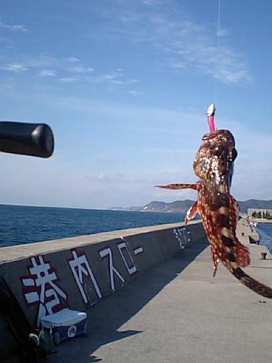釣り客は少ないと思って選んだ4日。 しかし、思いのほか、釣り人が多く船は満員・・・ 釣場に着くと、波戸の先端は青物狙いのルアーマンで密集状態だった。 アラカブ狙いの私だけ一人離れて、釣り開始。 バスロッドにabuのベイトリールをつけて、エコギアのグラスミノー(M)を投入・・・まだ、暗かったので様子見のつもりが、一投目からアタリ!! 残念!! フッキングに至らず。 しかし、すぐに再びアタリ!! 今度はのった。 20センチ強のアラカブをゲット! 幸先良く、一投目からヒットと思っていたら、そこからは入れ食い状態。 15センチから20センチ強のアラカブが次から次に掛かる・・・ 「楽しい!!」 ちょっと、バックラッシュしてみたり、フッキングが難しくバス合わせしてみたり・・・ 1時間強は楽しんだ。 最大は 28センチ。 必要な分 20センチオーバー7匹だけキープして、残りはリリースしたから20匹近くは釣ったと思います。 刺身サイズは上の一匹だけ。 サイズはやや不満が残るものの、とても楽しかった。これで、根がかりが少なければね~ 一日で、ワームを2パックも使ってしまった・・・ さて、帰港してのミーティングでは、楽しい仲間が遊んでいる お土産のつもりが船長に凶器を渡してしまった・・・かに?