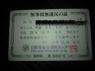 免許の更新がやってきた。 ゴールド免許 なので5年ぶりの更新となる。しかも 平成5年7月から15年と3ヶ月、無事故無違反!!自分でもちょっと驚く記録です。 その、15年と3ヶ月前、最後の違反自体が何だったのか?記憶に無いが、駐車違反かシートベルトか? そんなところでしょう。 そのため、今回もゴールド免許となり、4期目となるのかな? 違反すると、面倒だし、お金もかかるし・・・ このまま無事故無違反を続けたいモンですが、こればっかりは運もあるし・・・ 皆さんも とにかく、安全運転だけは心がけましょう!!
