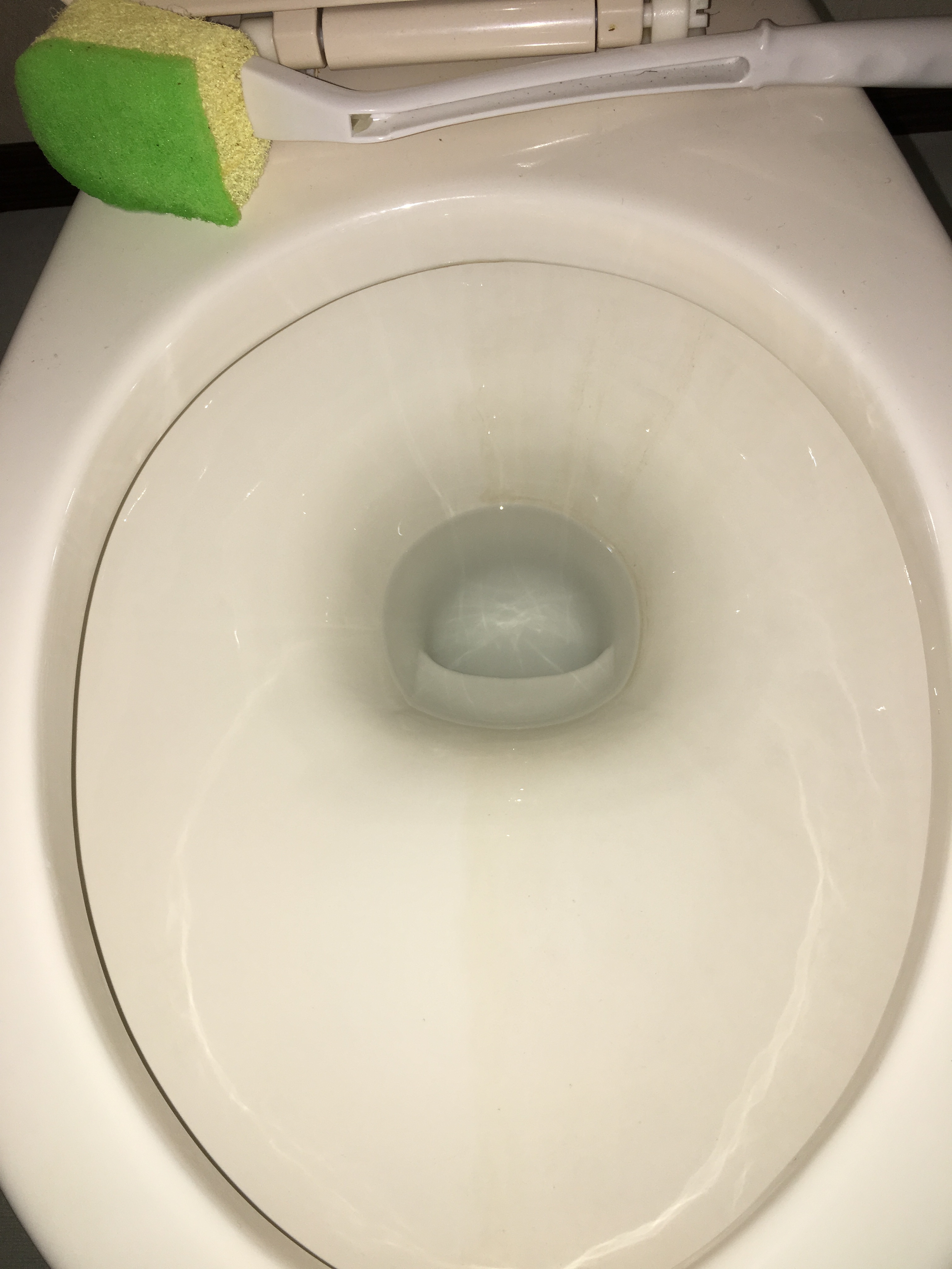 便器を拡大して見ると分かると思うのですが、半分だけ磨いています。黒ずみが綺麗になってるでしょ〜。