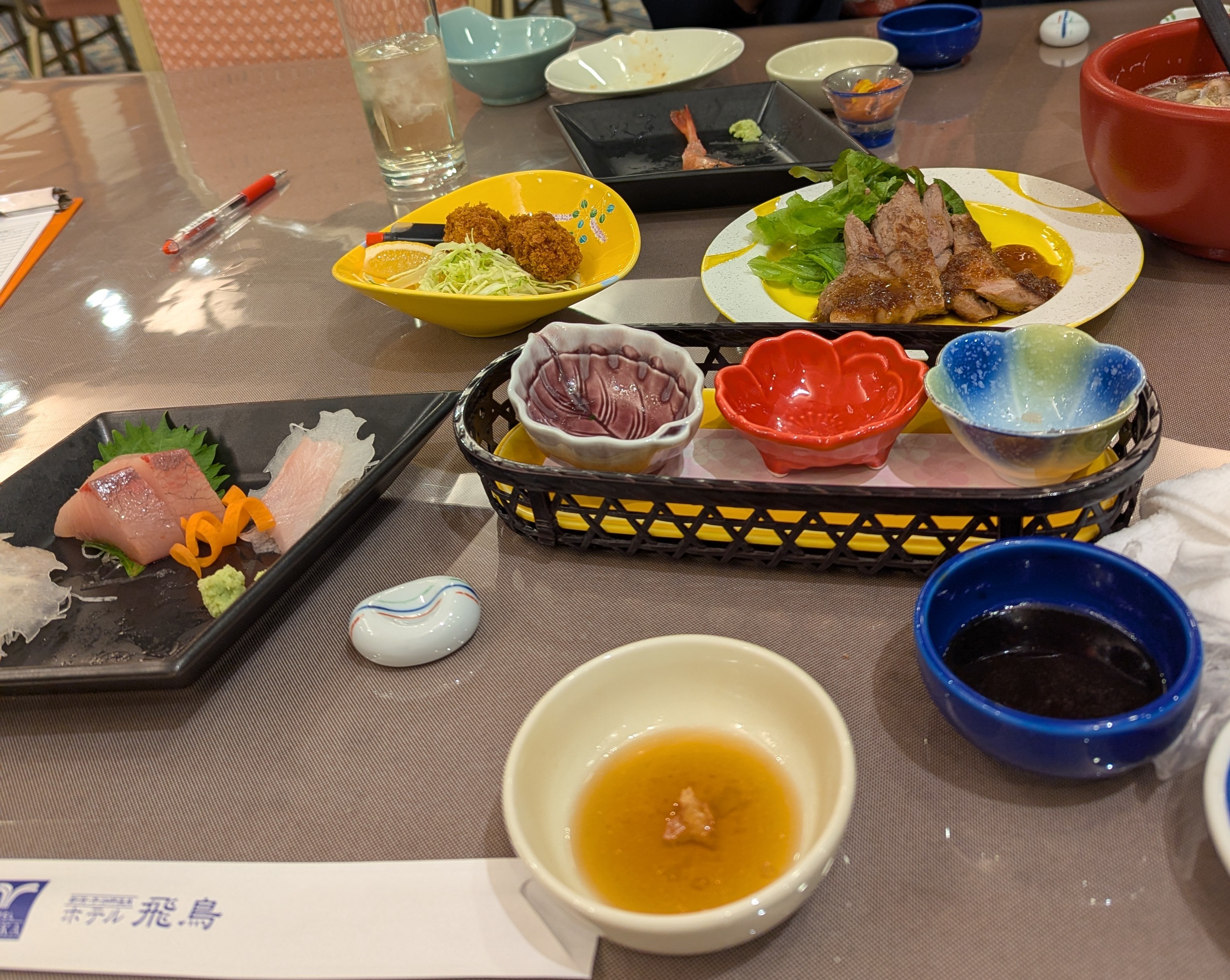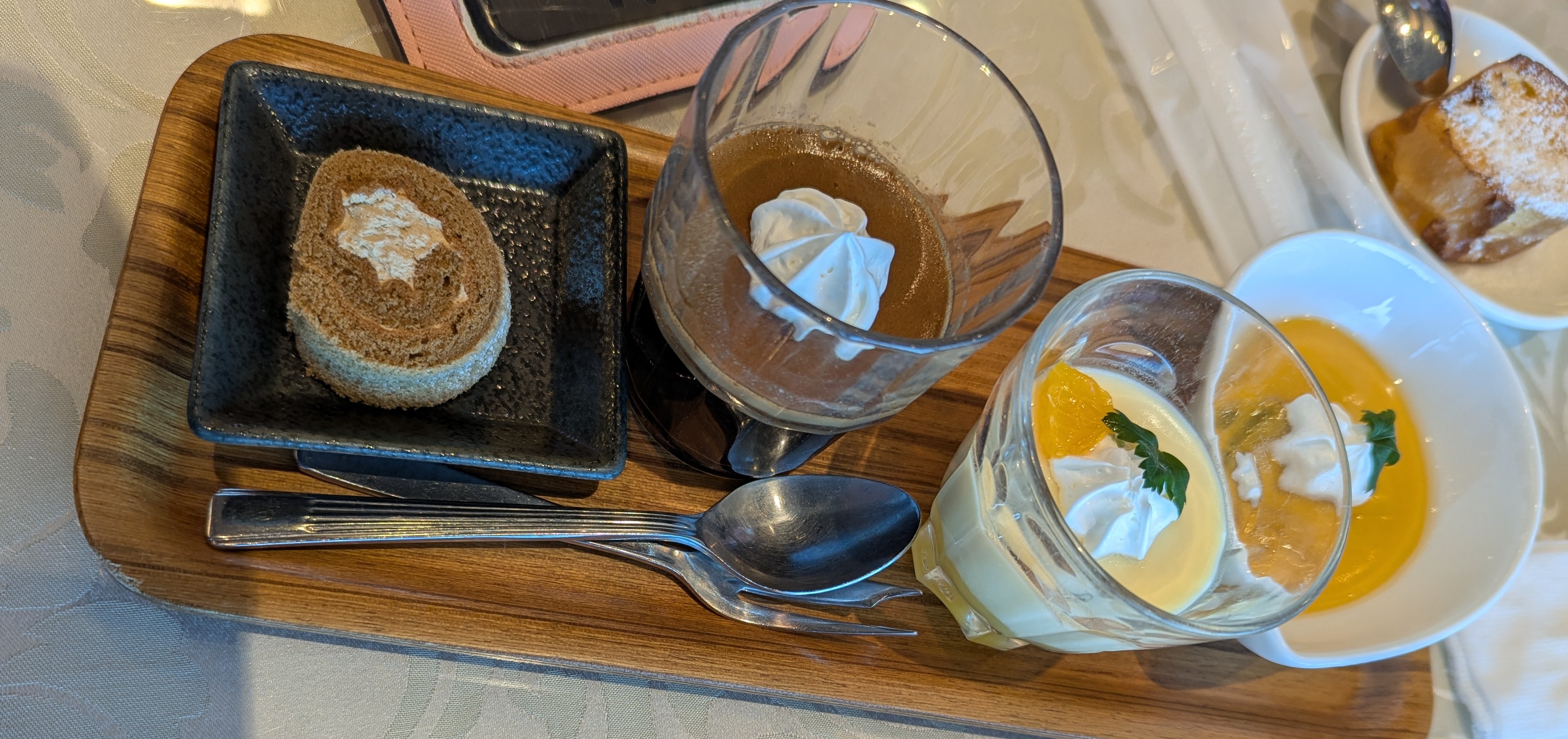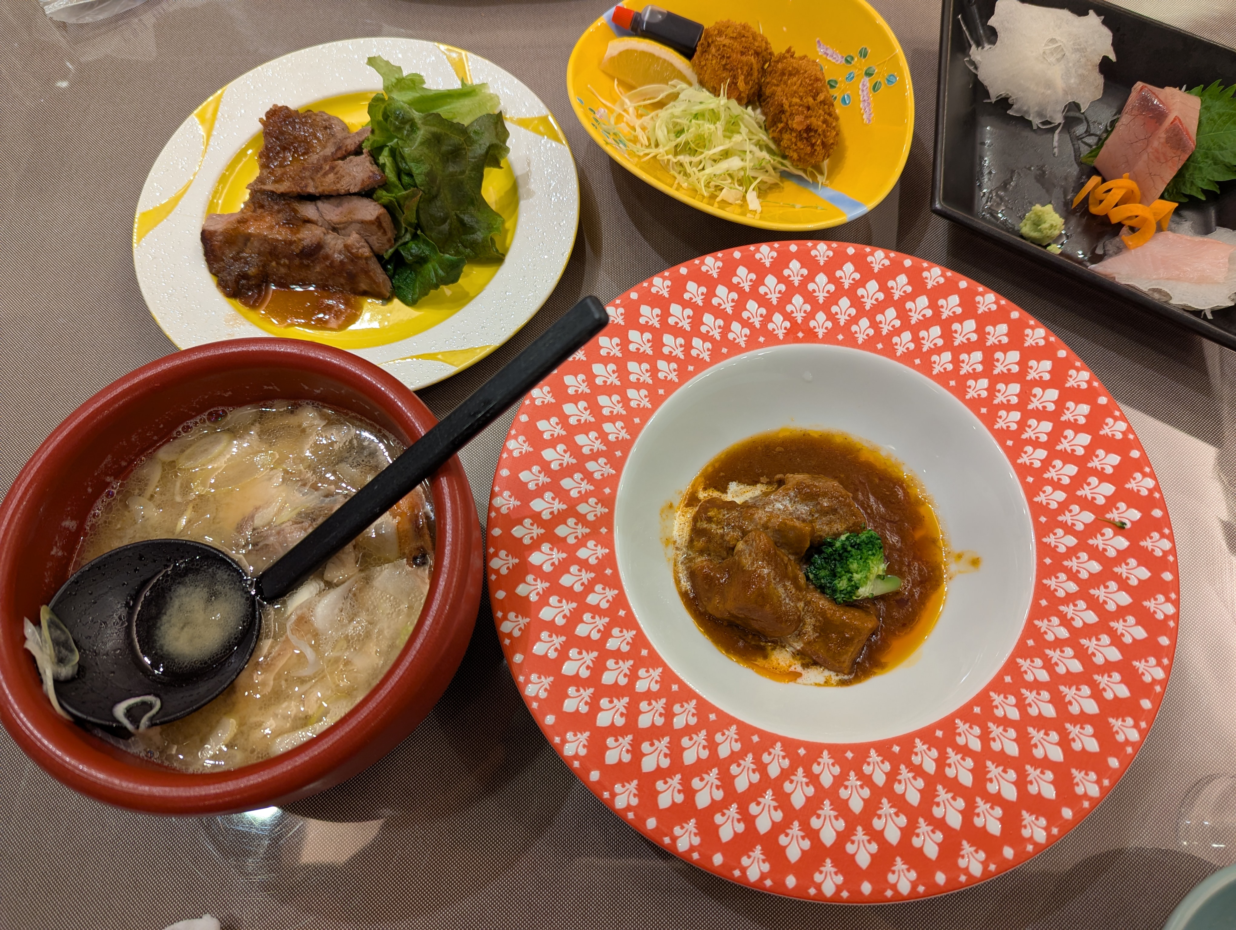 夕食は選べるバイキングとかで注文すると作って来てくれました。食べて一部空の食器あります。
