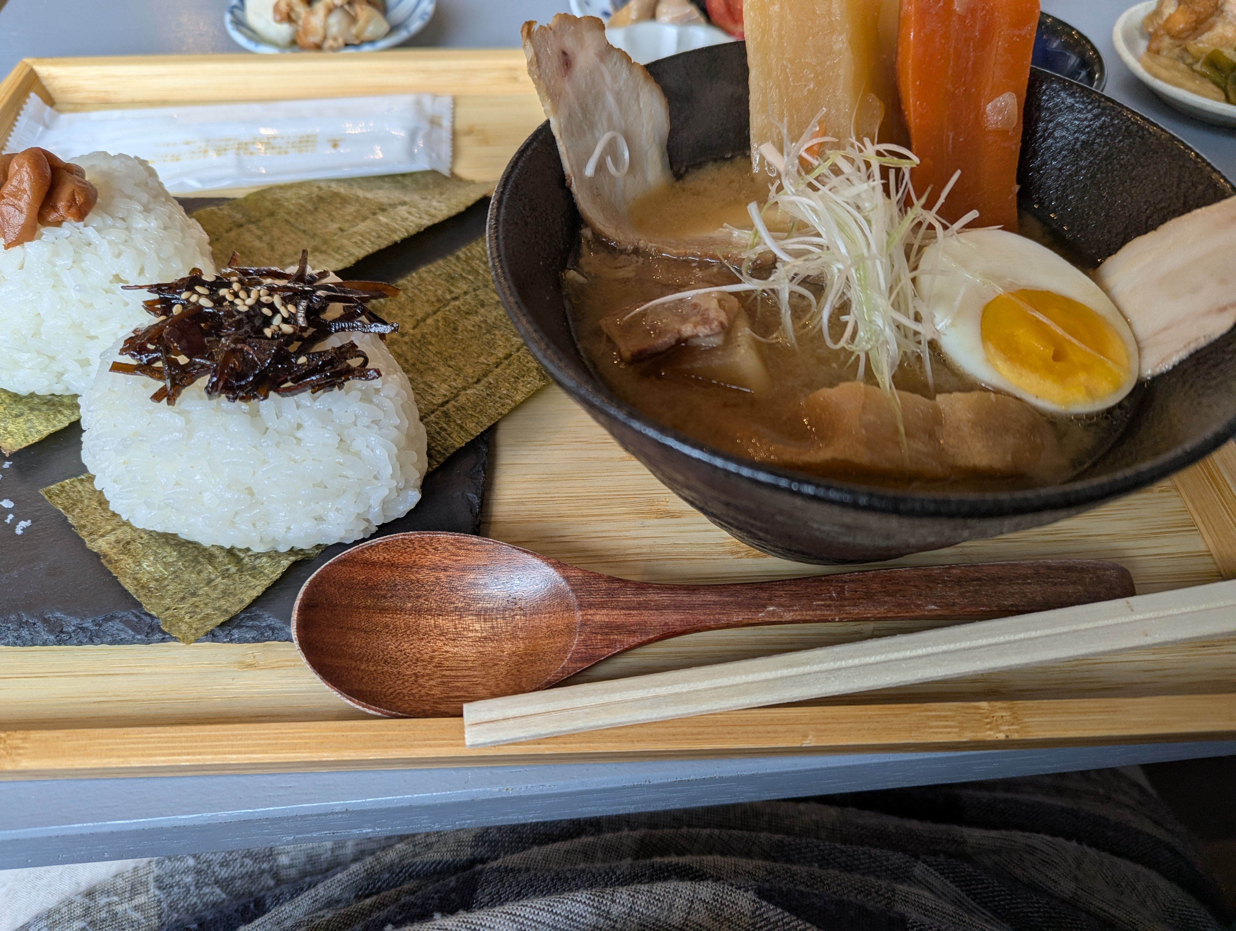 おはようございます😊☁️先日ちょっと遠い(1時間位かな。) 乗ってるだけだから遠く感じました。三条方面へ豚田汁米(とんだじゅうべい)と読みます。まだ2回目なんです。何時も混んでて入れない。おにぎりと豚汁のお店です。野菜がとても大きいんです。おにぎりも一つ一つが大きくて。少ないメニュー頼めばいいことなんですけどね。普通おにぎり、プチおにぎりもあったんですけどね。具が大きいから美味しかったです。見附のほっとぴあ初めて行きました。娘は良く来るようです。こんな遠いのに。。。三階に行かなかったのですが岩盤浴があるらしくそれで来るんだって。新潟にもあるよって😁😁😁連れて行ってもらってそんなこと言えません。夕方から開くアイスパフェ屋さんへ車の中で食べました。持ち帰り専門だからね。