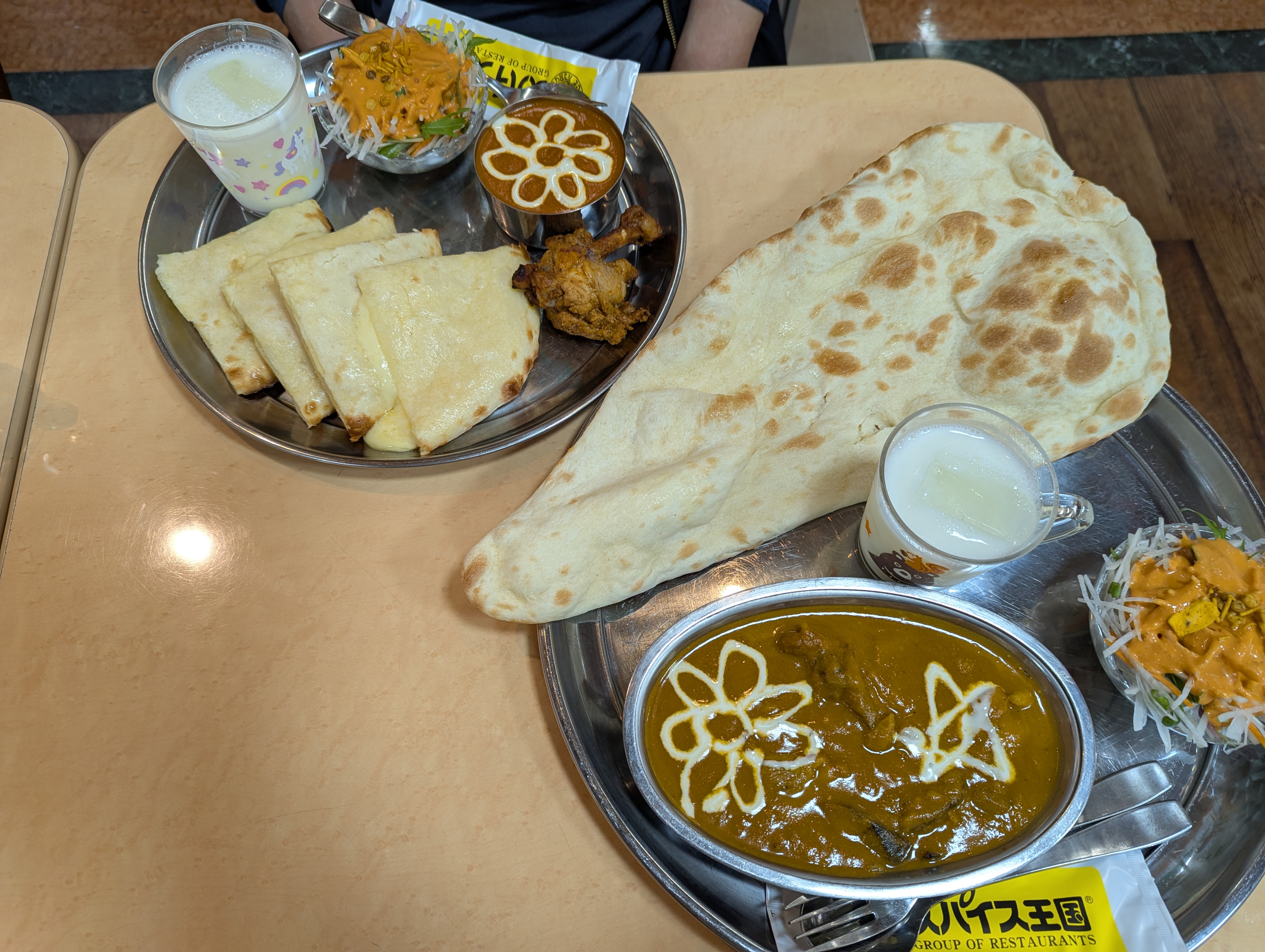 こんにちは😊☀️一ヶ月経ったのにまだ完全に治らない腕です。曲げ具合によってなので痛くない程度に動かしてます。あちこち行くのも面倒くさくなったから今月の内科受診で言って見ます。何でも診てくれるからね。こたつやっと片付けました。朝晩はエアコンでしのいでます。カーペットも外して何年か使ったのでハサミで切ってゴミに出すことにしました。袋2つになりました。きゅうり苗2本植えました。もうちょっと大きくなったら載せますね。娘にお化けきゅうりにしないようにと(つまり毎日見てろと)言われてるようです🤣チーズナン(上の方)食べたくてスパイス王国へ行ってきました。