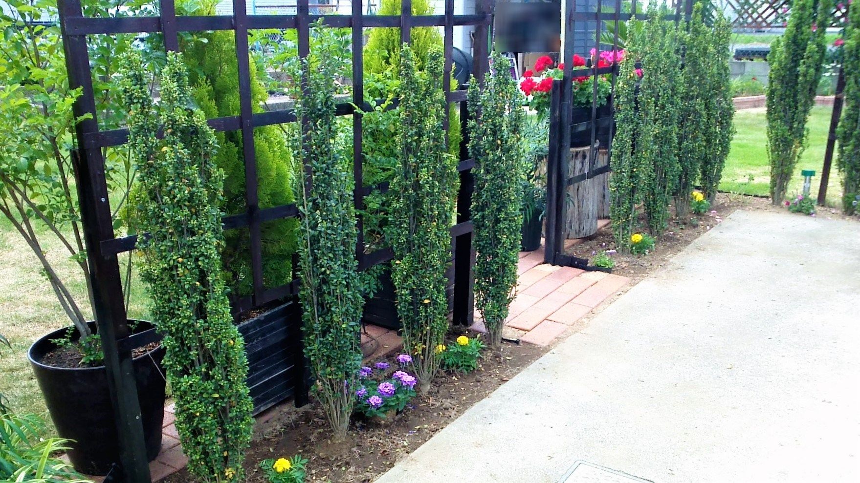 ↓(2016/05/26)駐車場花壇(今はL字花壇と読んでいます)を作り、スカイペンシルを植えました。