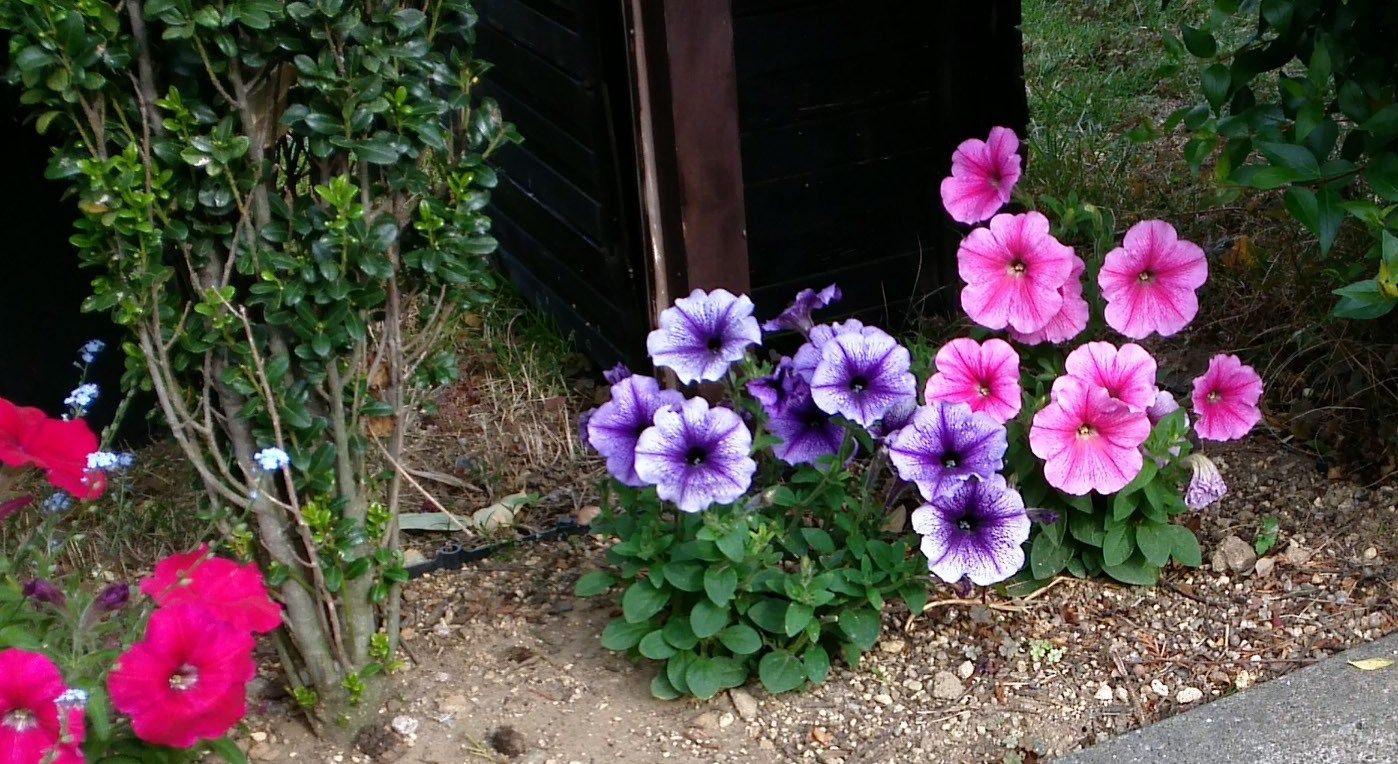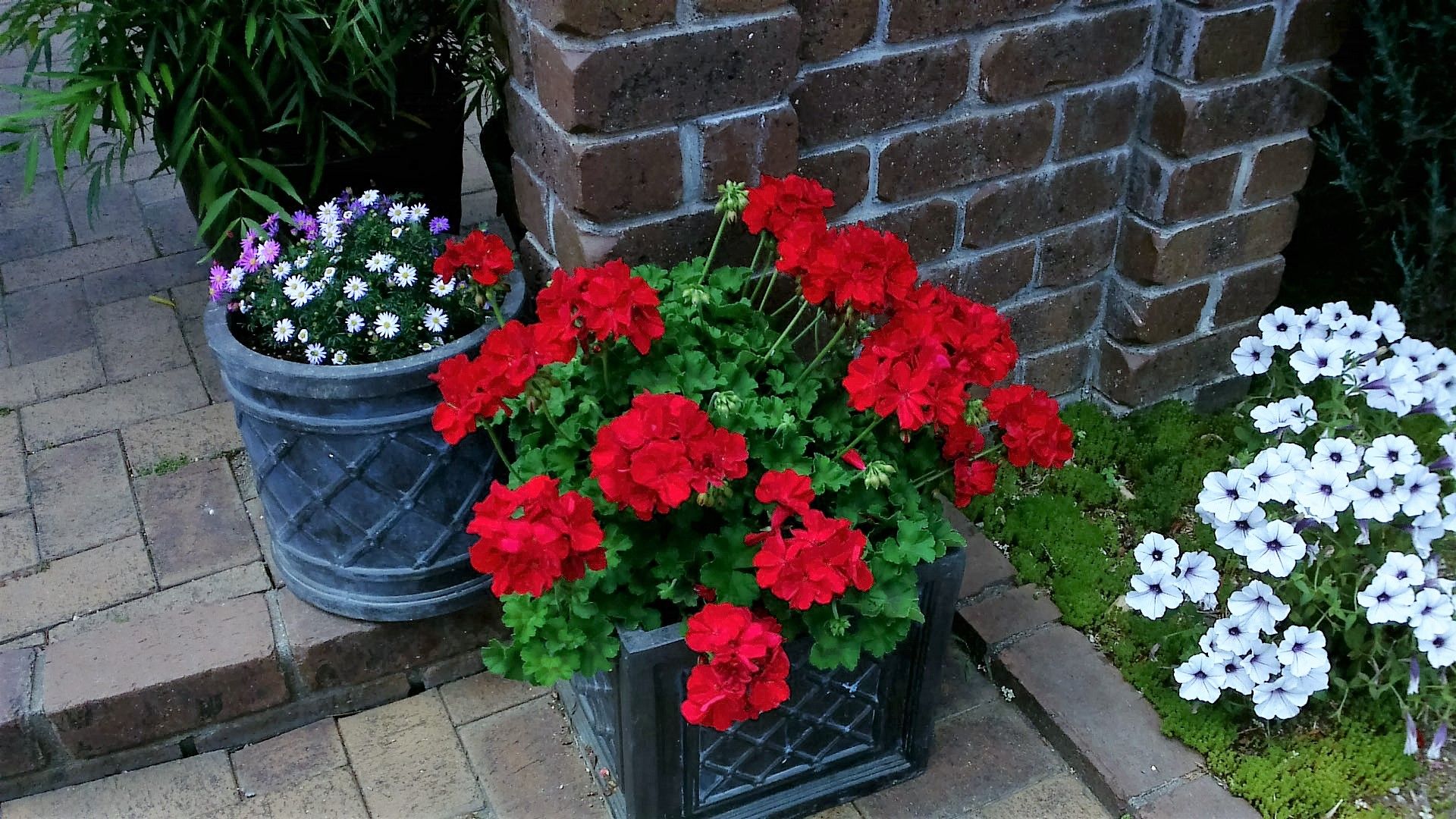 ↓(2016/05/26)左から、ブラキカム3色、ゼラニウム・カリオペ、ペチュニア・タイダルウェーブです。