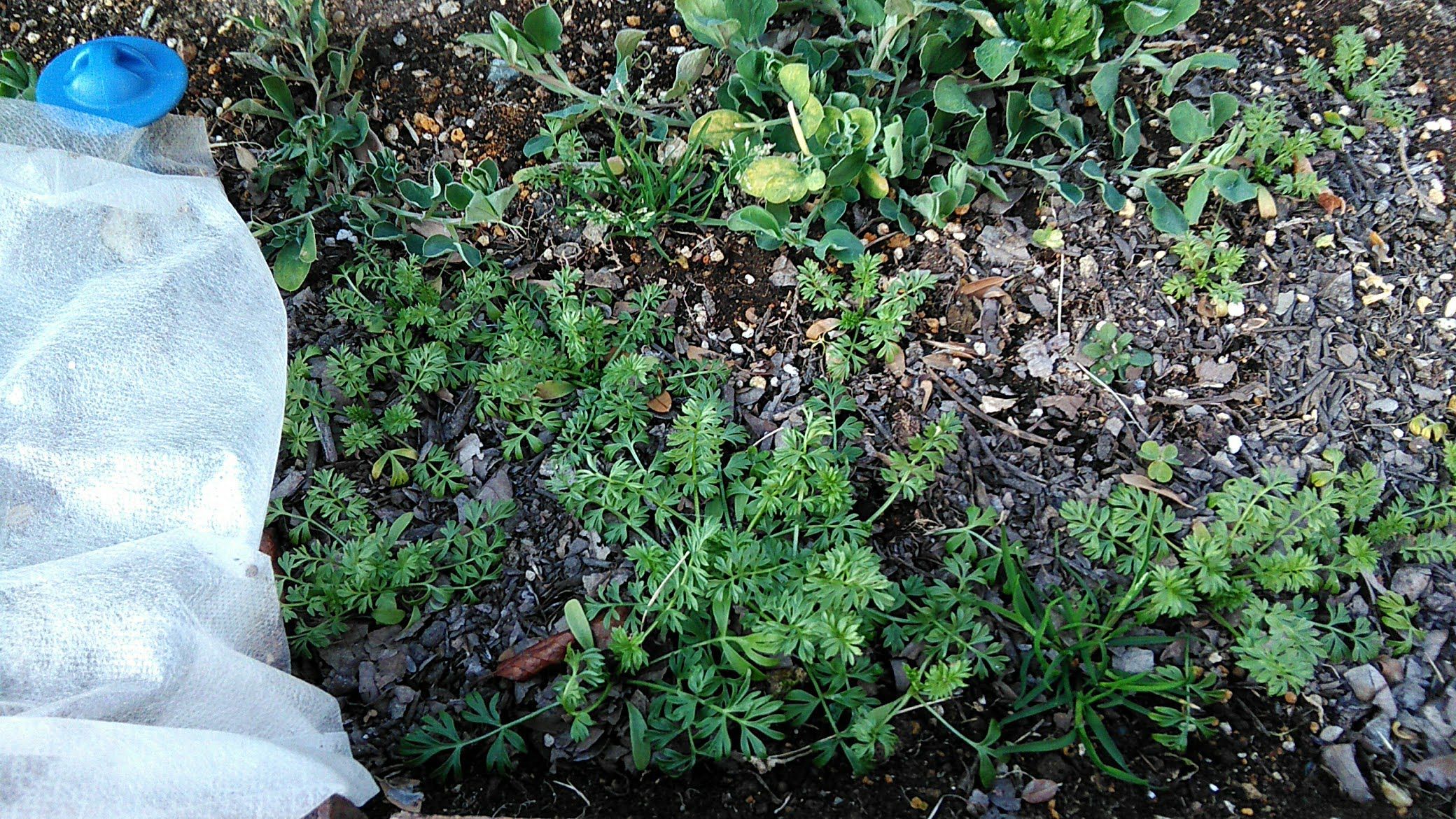 ↓不織布の下のニゲラも元気です。画面上はスイトピー。