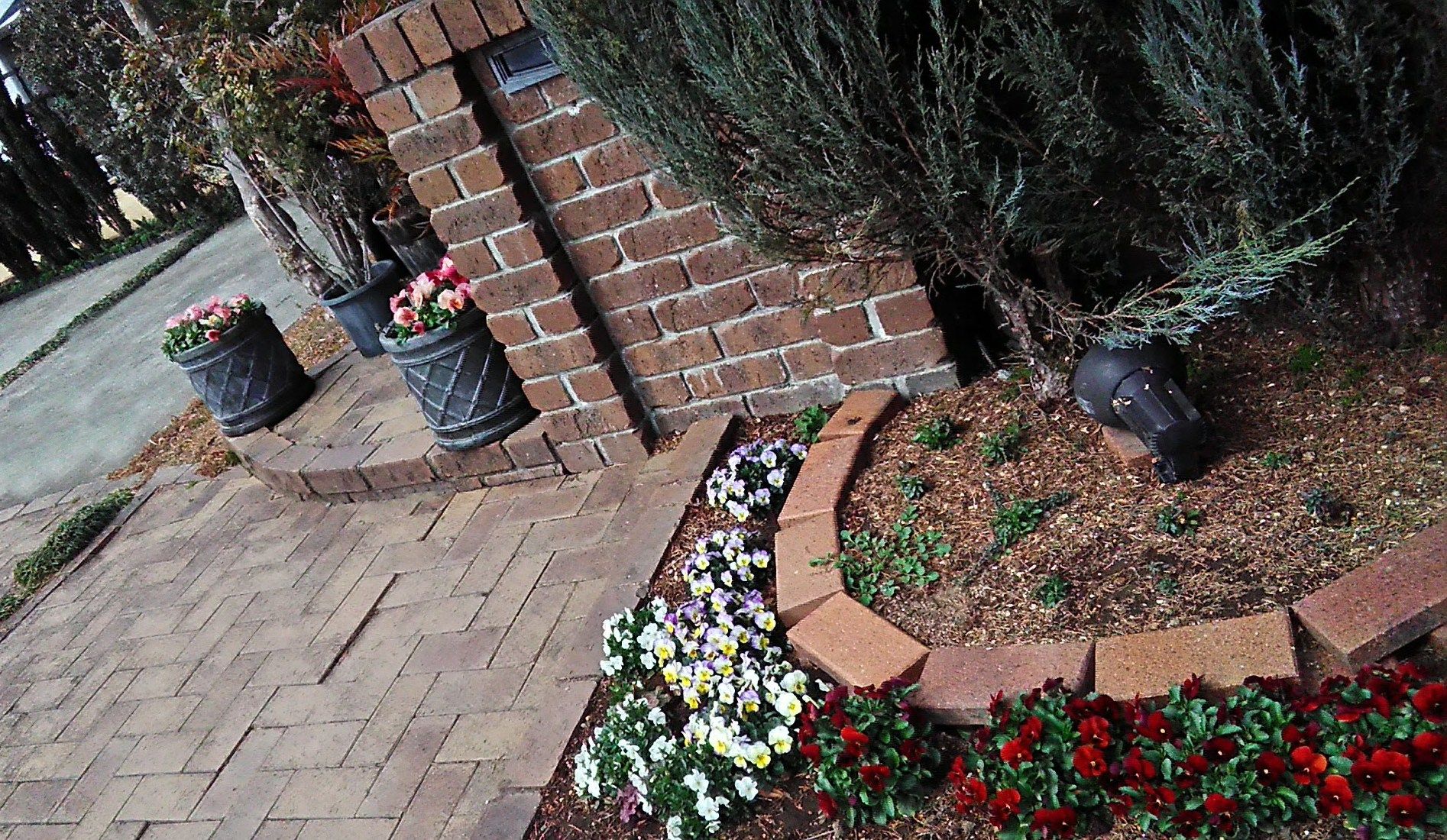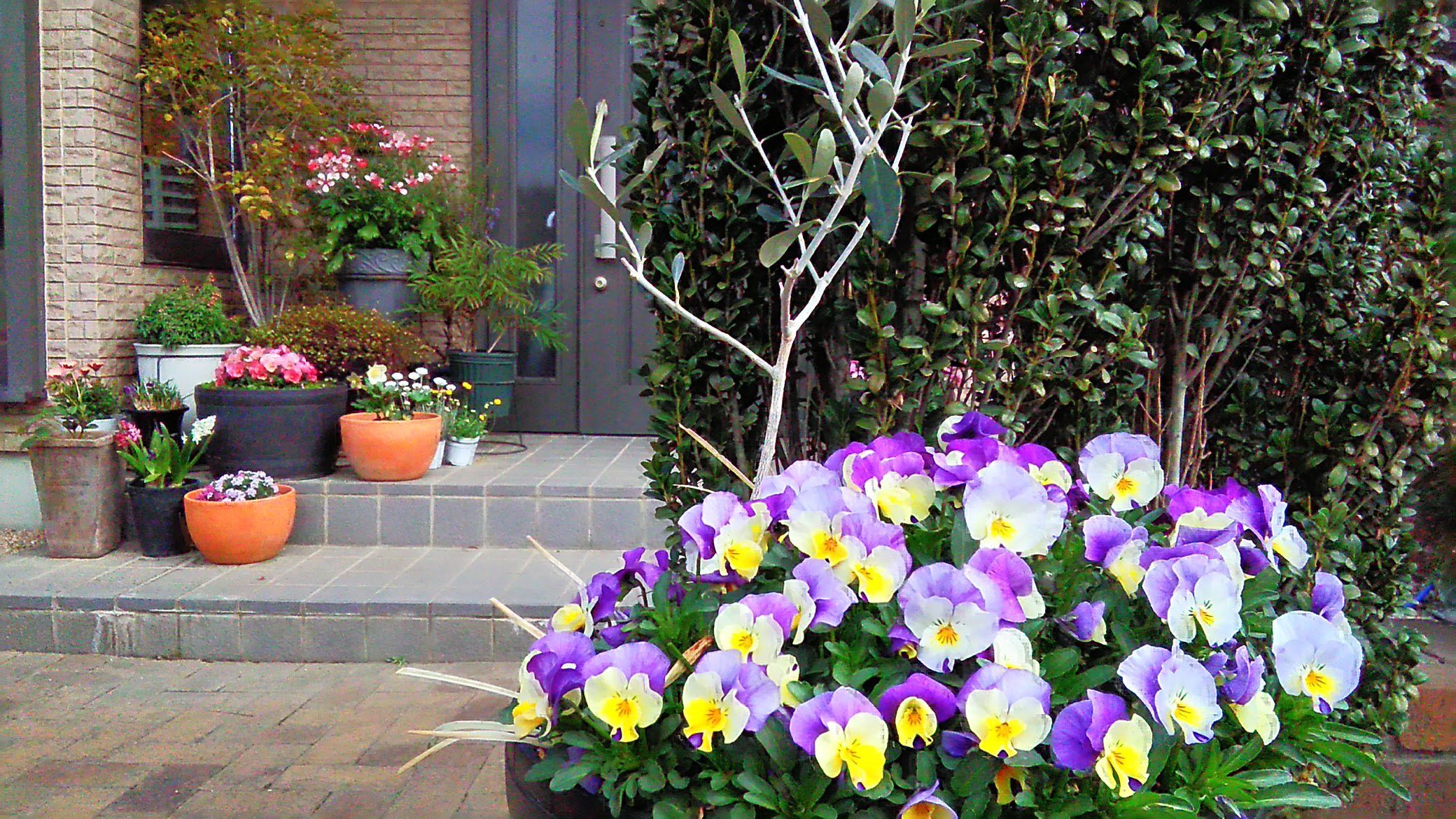 ↓玄関前の花達。鉢植えのシマトネリコは枯れ枯れです。