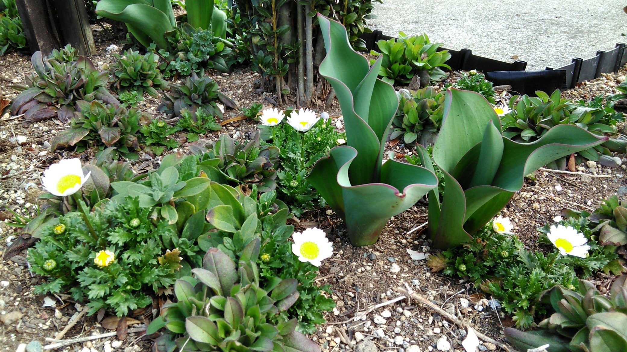 ↓庭ではノースポールの花が咲き始め、チューリップの葉が育ってきました。