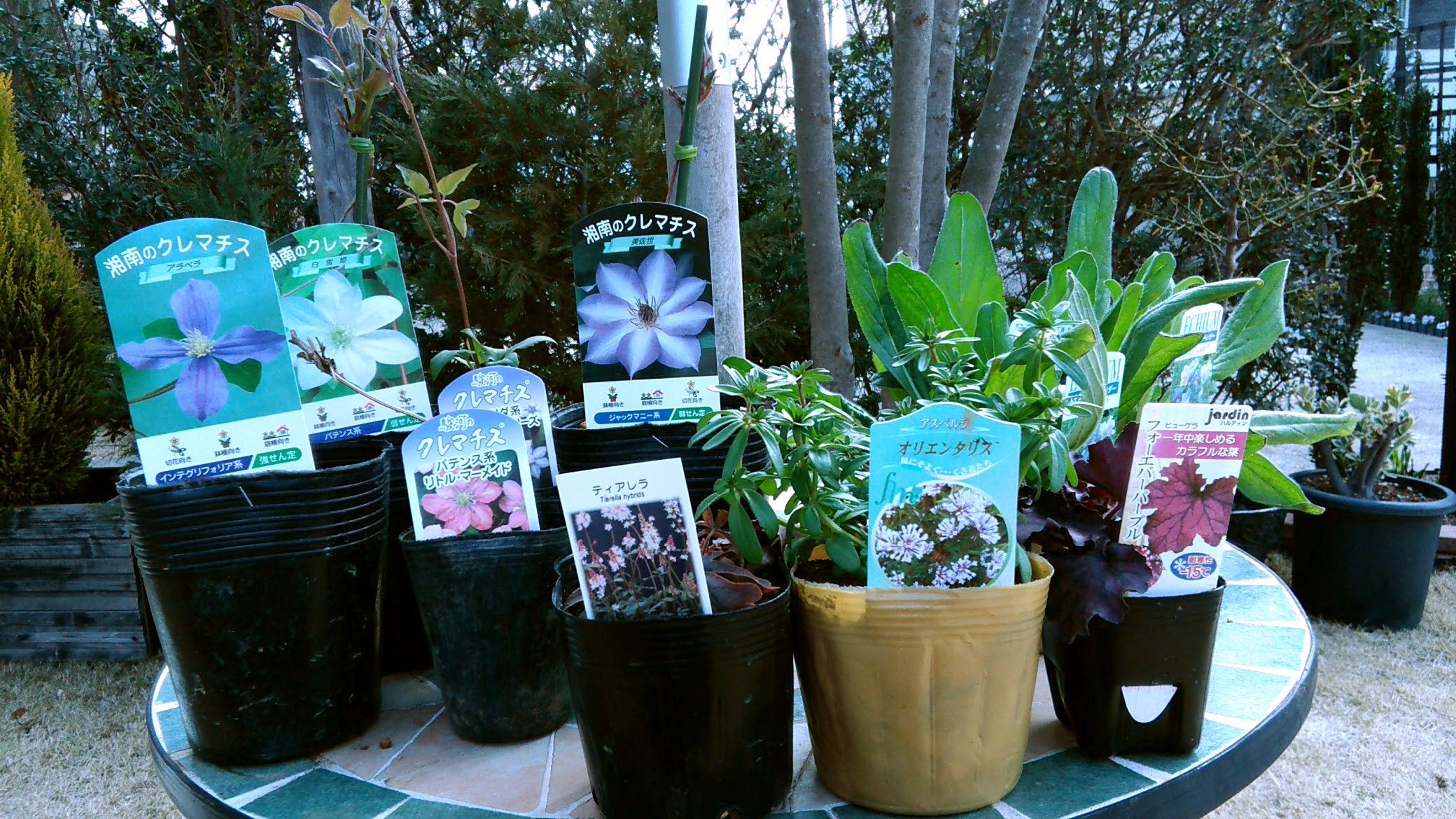 クレマチス5種、二年苗のほうがすぐに花が咲くのでしょうが、お値段が3倍なので、たくさん種類が欲しくて1年苗ばかりです。強健性を重視して選びました。