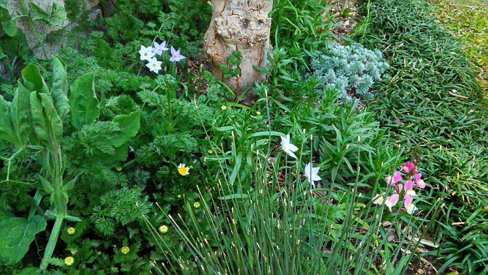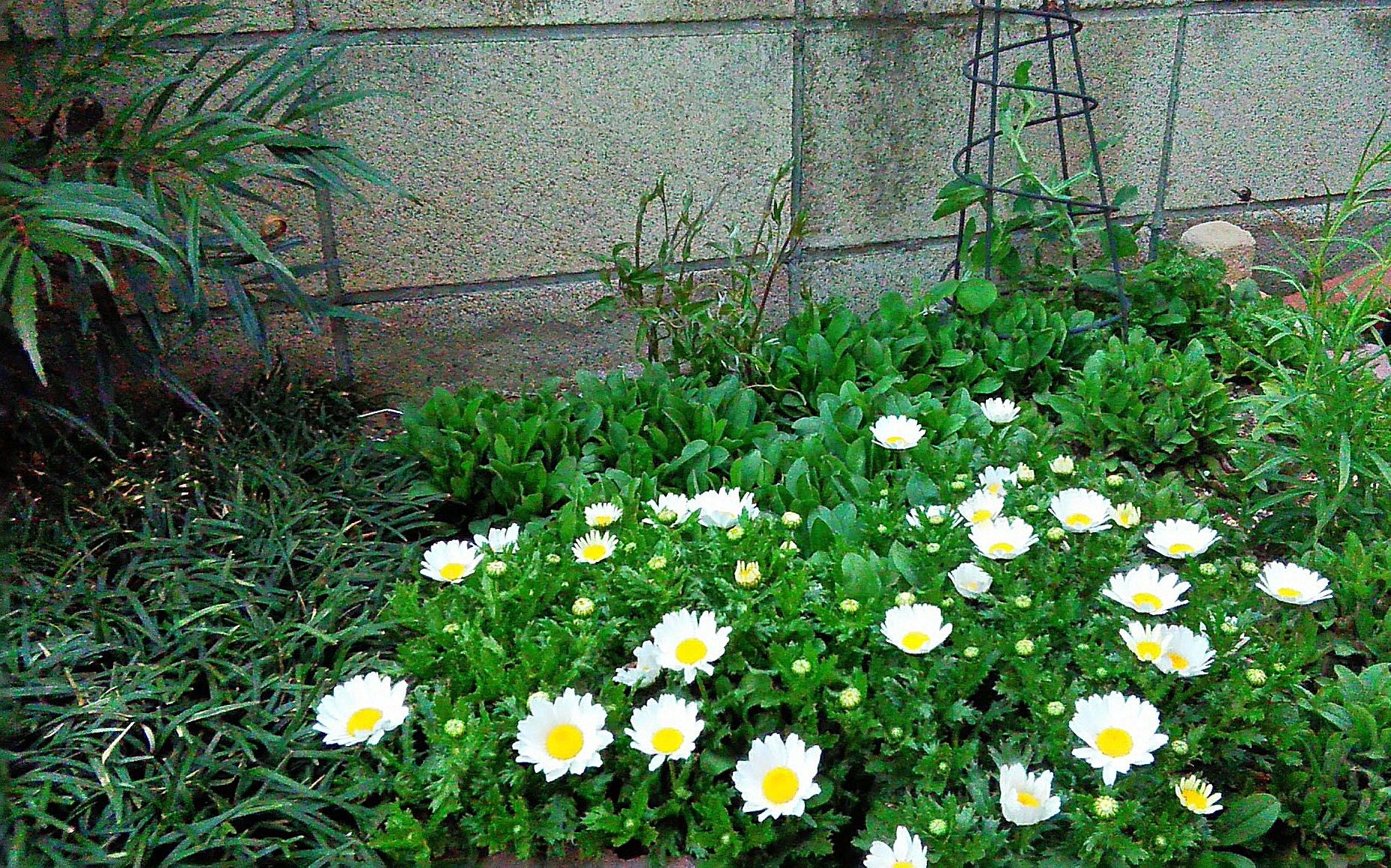 ↓ノースポールも増えてきました。奥の右側に見えるのはスイトピーです。今日はあちこちにあるスイトピーの苗に支柱を立てました。