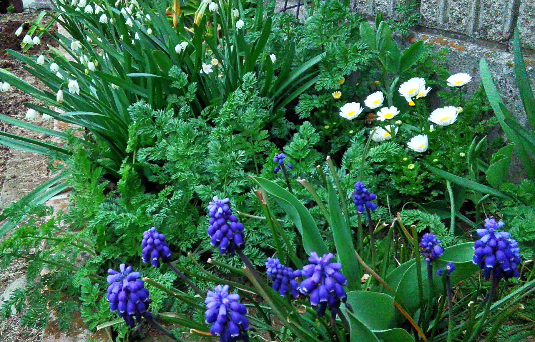 ↓ムスカリ、ノースポール、スノーフレークの共演、寒くて花が長持ちしています。