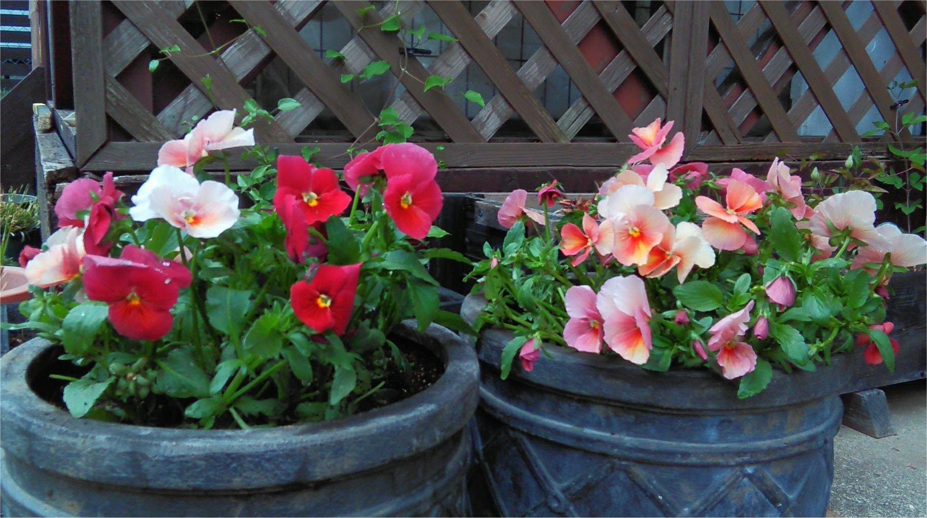 ↓こちらは同じキューティアプリコットを、25cmほどの鉢に2株づつ植えたので、押されて潰され可愛そうな状態になっています。パンジーは花びらが大きいのでなおさらですね。