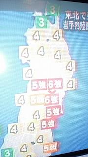 実はヲトメ達は今朝、岩手県にいたワケでし。。。んで、旅館でウマーい朝食を食らっていたトコロ、グラグラと強い地震。とは言え、ヲトメ達が居た場所は安比高原付近だったため震度3か4で済んだ。不思議な事に揺れてる時って知らない人ともアイコンタクトするんでしよね。。。何かイヤな予感がしたヲトメは友達と「逃げる?」と席を立ちかけたんでしが。。周りの皆様(朝食を食っている方々)冷静にもくもくと食ってるのだ。旅館の人も「あれー?地震?」みたいなノリで落ち着いてたし。。。。そのうち揺れも治まったので再び食事を続けたのだ。で、部屋に戻ってテレビをポチっとつけたらば。。。 こんな事に。。。いくらなんでも家に無事だ連絡をしなければとケータイにてTEL。。。「。。。。」通じねぇ。。。と、公衆電話があるじゃないヨ~と行ったら先約がいて「通じません。。。」とガッカリして戻っていったのだ。ヲトメがチャレンジしたら通じた。。。とりあえず無事と報告し部屋に戻るとこんな事に。。。。 この後強い余震が来ますよ!警戒してください。の予告が!この直後「安全なトコロに避難してください」と画面に出た。友達らは「ひょーコワーイ!!」と騒いでた。でもヲトメ達の居る場所は何事もなかった。この後、無事に帰ってきました。。。岩手・宮城内陸地震 の被害に遭われた方々にお見舞い申し上げます。ヲトメ達のプチ旅 ~IN 安比高原~ は後日UP予定でし。とりあえず地震報告という事で。