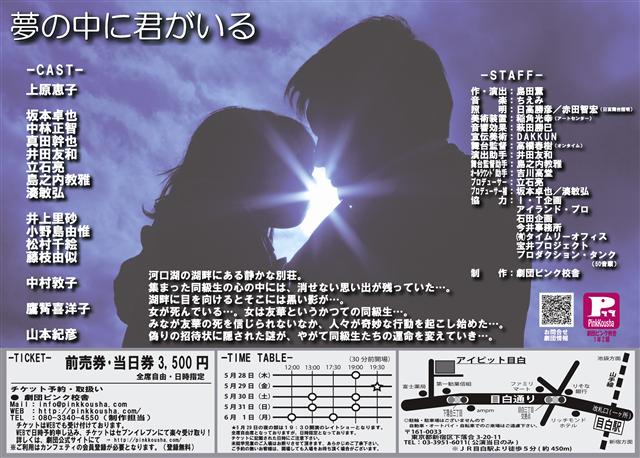 今日は劇団ピンク校舎の舞台を見に行きました めちゃくちゃ泣けるんです ・・・てか私28日からスタッフとしてお手伝いさせていただいてます それでねやっぱり「生」ってイイですゲネの時に始めて見たのですが 改めて今日見て・・・ 泣けるところが違うんです その時々の役者さんのテンションとか「間」で変わってくるのだと思います 明日は千秋楽です皆さんも「生」の舞台を見てみて下さいあらすじ 河口湖の湖畔にある静かな別荘。集まった同級生の心の中には、消せない思い出が残っていた...。湖畔に目を向けるとそこには黒い影が...。 女が死んでいる...。 女は友華というかつての同級生...。みなが友華の死を信じられないなか、人々が奇妙な行動を起こし始めた...。偽りの招待状に隠された謎が、やがて同級生たちの運命を変えていき...。 公演日程(アイピット目白) 5月28日(木) / 19:00 5月29日(金) / 19:30★レイトショー 5月30日(土) 13:00 / 19:00 5月31日(日) 13:00 / 19:00 6月 1日(月) 12:00 / 17:30開場は開演30分前です。全席自由・日時指定となりますので、ご予約の際にご希望の日時を指定して下さい。未就学児童のご入場はお断り致します。 CAST 上原恵子 坂本卓也中林正智真田幹也井田友和立石亮島之内教雅湊敏弘 井上里砂小野島由惟松村千絵藤枝由似 中村敦子 鷹觜喜洋子 山本紀彦STAFF 作 ・演出:島田薫 音 楽:ちえみ 照 明:日高勝彦/赤田智宏(日高舞台照明) 美術装置:稲角光幸(アートセンター) 音響効果:萩田勝巳 宣伝美術:だっくんイラストレーション:AMD舞台監督:高橋春樹(オンタイム) 演出助手:井田友和 舞台監督助手:島之内教雅 オールラウンド助手:吉川高堂 プロデューサー:立石亮アシスタントプロデューサー:坂本卓也装置協力:小野寺弘之受 付:菅野佐知子/松倉かおり(ノアノオモチャバコ)☆☆☆☆☆ 石塚美咲1stフルアルバム『Tout de moi』がiTunes Storeにて配信開始となりましたダウンロードよろしくお願い致しますURLhttp://itunes.apple.com/WebObjects/MZStore.woa/wa/viewAlbum?id=316521612&s=1・iTuneのダウンロードがお済でない方はこちらからhttp://www.apple.com/jp/itunes/download/
