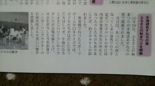 お世話になった方から「紹介されてるよ」との報告は受けていたのですが実際に我が家にも届いていたので写真撮ってみました水海道あすなろの里で開催された「ふるさとの秋まつり」の際の記事ですそこに書かれたいた「石塚美咲さんも美しい歌声を披露しました。」の文字に小躍りしました関係者の皆様には本当にお世話になりました常総市、大好きです 美咲すけじゅ~るFM84.2ラヂオつくば●毎週火曜日23:00~「石塚美咲と唄種ラヂオ」 番組宛てメッセージはこちら※ネットでのご視聴はサイマルラジオから♪石塚美咲ミニアルバム「Crescendo」(←YouTube)4曲入り1,200円(税込)Live会場・配送にて販売中!配送ご希望の方はこちらからご注文くださいませ♪メルマガ「misaki's mail」会員さま募集!1stフルアルバム『Tout de moi』 10曲配信中! <着うた>「レコチョク」 「TSUTAYAプレミア」 「GIGA MUSIC」 「mu-mo」 「music.jp」 「iTunes」 「mora」 美咲Live映像「YouTube」info:Ishitsuka Misaki Live実行委員会
