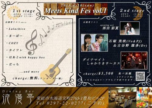 音楽を通して優しさに出会える。。。そんなお時間を水海道で共有し合えたら、とても幸せな事ですね♪そんな気持ちで開催する「Meets Kind Fes Vol.1 」是非、お越し下さいませ。12時からはアコースティック無料ライブで憩いのひと時♪18時からは、バリエーション豊かな音楽と共にDining Bar浪漫亭さんのお料理が食べ放題です。ご参加お待ち致しております♪2015年5月10日(日)【1st Stage】 OPEN 12:00START 12:30<Cast>◇Lalachico◆まーぼー◇COZY◆カイワレ◇はあと with happy box◆だっち ...and more<Charge>無料(1オーダー制)【2nd Stage】OPEN 18:00START 18:30<Cast>◇西田彩夏◆石塚美咲&古谷野雄多◇ダイナマイトしゃかりきサ~カス<Charge>3,500円(バイキング・ウーロン茶付き、ドリンク別)<アクセス>茨城県常総市水海道宝町2765-1 豊和ビル2Ftel:0297-22-0277(ご予約)関東常総線「水海道駅」より徒歩3分※お車でお越しの際は、お店裏側の駐車場、もしくはアオキ(青木)衣料品店様隣の駐車場をご利用下さいませ。2ndステージのご予約はこちらから(^^*)是非お会い致しましょう♪どうぞ、よろしくお願いいたします。 ☆美咲スケジュール☆◆5/10(日)18:00open常総市「Dining Bar浪漫亭」Music Charge 3500円(ドリンク別、食べ放題)Vo&Pf.石塚美咲 Dr.古谷野 雄多他、出演者多数 ◆5/30(土)取手市「伊太利庵ボーノ」OPEN 17:30 START 19:00Music Charge 2,000円(1ドリンク付)40席Vo.石塚 美咲 Gt.Takahiro Nakajima Dr.古谷野 雄多ご予約はこちらからお願い致します。◆6/27(土)つくば市「ELEGANCE」Vo.石塚 美咲 Gt.Takahiro Nakajima Dr.古谷野 雄多※詳細は後程FM84.2ラヂオつくば毎週火曜日23:00~「石塚美咲と唄種ラヂオ」 番組宛てメッセージはこちら※ネットでのご視聴はサイマルラジオから♪石塚美咲ミニアルバム「Crescendo」<配信先>iTunes Amazon< CD>4曲入り1,200円(税込)Live会場にて販売中!1stフルアルバム「Tout de moi」 10曲配信中!「iTunes」 「mora」<着うた>「レコチョク」 「TSUTAYAプレミア」 「GIGA MUSIC」 「mu-mo」 「music.jp」無料メルマガ「misaki's mail」会員さま募集!美咲Live映像「YouTube」出演依頼:Voice Presenterまでお問い合わせお願い致します。 ※ナレーションのご依頼もお待ちしております。