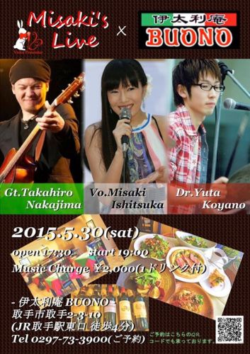 2015年5月30日(土)Misaki's Live × 伊太利庵BUONO茨城県取手市にあります「伊太利庵BUONO」にてLiveを開催します。素敵なお店の雰囲気、お料理と共に石塚美咲のオリジナル曲を中心に素晴らしいメンバーと共に音楽をお届け致します。どうぞよろしくお願い致します。<日時>2015年5月30日(土)OPEN 17:30START 19:00<Cast>Vo.石塚美咲Gt.Takahiro NakajimaDr.古谷野雄多<Guest>Vo.ひづきようこ<Music charge>2,000円(1drink付き)<アクセス>「伊太利庵BUONO」茨城県取手市取手2-3-10(JR取手駅東口徒歩4分)Tel.0297-73-3900ご予約はこちらから(*゚▽゚*)どうぞよろしくお願いいたします!音響:サンドリーミュージック☆美咲スケジュール☆◆5/10(日)18:00open常総市「Dining Bar浪漫亭」Music Charge 3500円(ドリンク別、食べ放題)Vo&Pf.石塚美咲 Dr.古谷野 雄多他、出演者多数 ご予約はこちらからお願い致します。◆5/30(土)取手市「伊太利庵ボーノ」OPEN 17:30 START 19:00Music Charge 2,000円(1ドリンク付)40席Vo.石塚 美咲 Gt.Takahiro Nakajima Dr.古谷野 雄多ご予約はこちらからお願い致します。◆6/27(土)つくば市「ELEGANCE」Vo.石塚 美咲 Gt.Takahiro Nakajima Dr.古谷野 雄多※詳細は後程FM84.2ラヂオつくば毎週火曜日23:00~「石塚美咲と唄種ラヂオ」 番組宛てメッセージはこちら※ネットでのご視聴はサイマルラジオから♪石塚美咲ミニアルバム「Crescendo」<配信先>iTunes Amazon< CD>4曲入り1,200円(税込)Live会場にて販売中!1stフルアルバム「Tout de moi」 10曲配信中!「iTunes」 「mora」<着うた>「レコチョク」 「TSUTAYAプレミア」 「GIGA MUSIC」 「mu-mo」 「music.jp」無料メルマガ「misaki's mail」会員さま募集!美咲Live映像「YouTube」出演依頼:Voice Presenterまでお問い合わせお願い致します。 ※ナレーションのご依頼もお待ちしております。