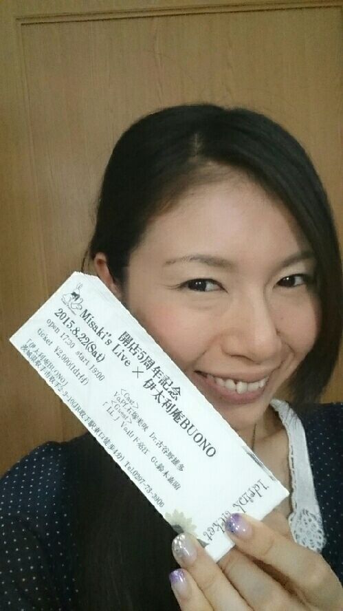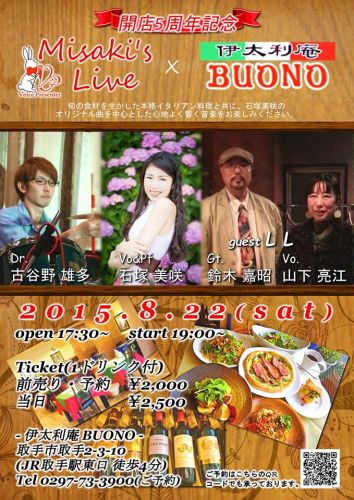 2015年8月22日(土)開店5周年を迎える茨城県取手市にあります「伊太利庵BUONO」さんにてLiveを開催します(>▽<*)!旬の食材を生かした本格イタリアン料理と共に、石塚美咲のオリジナル曲を中心に心地よく響く音楽を素晴らしいメンバーと共にお届け致します。ご都合よろしければどうぞよろしくお願い致します(^o^*) <日時>2015年8月22日(土)OPEN 17:30START 19:00<Cast>Vo.Pf.石塚美咲Dr.古谷野雄多<Guest>「 LL 」Vo.山下亮江Gt.鈴木嘉昭 <Music charge>ご予約 2,000円(1drink付き)当日 2,500円(1drink付き) <アクセス>「伊太利庵BUONO」茨城県取手市取手2-3-10(JR取手駅東口徒歩4分)Tel.0297-73-3900※お車でお越しの方はお近くのコインパーキングをご利用下さい。<ご予約>ご予約はこちらのフォームからお願い致します。https://ssl.form-mailer.jp/fms/d84e8fe4356187もしくは、メッセージ下さい(^^*)♪ ☆美咲スケジュール☆ ◆8/16(日)12:10~稲敷市Live&ビンゴ大会司会◆8/22(土)19:00~取手市BUONOVo.Pf.石塚美咲 Dr.古谷野雄多[Guest]LL(Vo.山下亮江 g.鈴木嘉昭)2000円(1dr付)◆8/23(日)筑西市どすこいペアVo.石塚美咲 Pf.大原創 Bs.永橋紀彦 Ds.古谷野雄多◆8/29(土)16:30常総きぬ川花火大会Vo.石塚美咲※詳細は後程◇「神保シェフと茨城をたべよう」6月分【Youtube】on-air! FM84.2ラヂオつくば毎週火曜日23:00~「石塚美咲と唄種ラヂオ」 番組宛てメッセージはこちら※ネットでのご視聴はサイマルラジオから♪石塚美咲ミニアルバム「Crescendo」<配信先>iTunes Amazon1stフルアルバム「Tout de moi」 10曲配信中!「iTunes」 「mora」<着うた>「レコチョク」 「TSUTAYAプレミア」 「GIGA MUSIC」 「mu-mo」 「music.jp」無料メルマガ「misaki's mail」会員さま募集!美咲Live映像「YouTube」出演依頼:Voice Presenterまでお問い合わせお願い致します。 ※ナレーションのご依頼もお待ちしております。