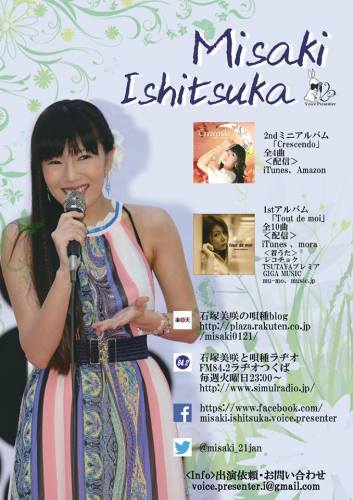 この度、沢山の企業・店舗様のご協賛を賜りまして無事にフライヤーを作ることが出来ました(^^*)!!本当にありがとうございます!これから私が行く先々で自身の宣伝とともにご協賛いただいた皆様の宣伝を行っていきたいと思っております!受け取って下さいました方は是非、隅々まで目を通していただければと存じます(°ω°)☆また、お店等にフライヤーを置かせていただければ大変有り難いです!未熟な私ですが、皆様のサポートの元活動が出来ることが大変有り難く、感謝いたしております。そして、是非下記、フライヤーに掲載の広告内容を一読頂けたらと思います♡ここからまた新しい出会いがありますように(>▽<*)!引き続きどうぞよろしくお願い致します(^^*)!________◆ハワイアン フラフラ ハラウ ピカケ テルヌマ080-1934-4166日立・ひたちなか・水戸・つくばinfo@pikake.jphttp://www.pikake.jp/________◆ネイルカレッジつくば校&ネイルサアロンGRANDA'ME029-886-3548つくば市春日2-33-6春日ビル3階http://ameblo.jp/grandame/________◆ひょうたん(常総市 運転代行)080-6891-800019:30~2:30https://www.facebook.com/pages/%E9%81%8B%E8%BB%A2%E4%BB%A3%E8%A1%8C%E3%81%B2%E3%82%87%E3%81%86%E3%81%9F%E3%82%93/508587835901860________◆イベント企画・音響Sundry Music090-4204-7718(小澤)筑西市玉戸1602-113https://www.facebook.com/hiroshi.ozawa.332________◆移動美容室 楓029-827-3368土浦市殿里307-1http://kaede-go.com/________◆産みたてたまご専門店TAMA HON!!常総市菅生町1059https://www.facebook.com/tamagoyahonpo________◆三竹山鎮座 一言主神社常総市大塚戸町875http://www.hitokoto.or.jp________◆cafe ohanaつくば市吾妻2-8つくば文化会館アルス内029-856-252710:00~17:00(月曜休)http://www.tsukamotogift.co.jp/cafe_ohana.html#works01________◆大和タクシーつくば市天久保1-7-180120-24-8300________◆OA機器取扱・印刷・デザインTaihousha.Inchttp://daiwa-gp.com________◆イベント企画・運営、アウトソーシング株式会社キャリア・プロデュース土浦市真鍋1-16-11延増第3ビル4F029-824-8122http://www.career-pro.co.jp/________ご覧くださいまして誠にありがとうございます(°▽°*)♡~おまけ~眉頭の当たりに骨がくぼんでる箇所があります☆そこをグゥ~っと押すと目の疲れにいいですよ(^^)♪☆美咲スケジュール☆ ◆8/16(日)12:10~稲敷市Live&ビンゴ大会司会◆8/22(土)19:00~取手市BUONOVo.Pf.石塚美咲 Dr.古谷野雄多[Guest]LL(Vo.山下亮江 g.鈴木嘉昭)前売り・ご予約2000円(1dr付)ご予約はこちらからお願い致します。◆8/23(日)筑西市どすこいペアVo.石塚美咲 Pf.大原創 Bs.永橋紀彦 Ds.古谷野雄多◆8/29(土)16:30常総きぬ川花火大会Vo.石塚美咲※詳細は後程◇「神保シェフと茨城をたべよう」6月分【Youtube】on-air! FM84.2ラヂオつくば毎週火曜日23:00~「石塚美咲と唄種ラヂオ」 番組宛てメッセージはこちら※ネットでのご視聴はサイマルラジオから♪石塚美咲ミニアルバム「Crescendo」<配信先>iTunes Amazon1stフルアルバム「Tout de moi」 10曲配信中!「iTunes」 「mora」<着うた>「レコチョク」 「TSUTAYAプレミア」 「GIGA MUSIC」 「mu-mo」 「music.jp」無料メルマガ「misaki's mail」会員さま募集!美咲Live映像「YouTube」出演依頼:Voice Presenterまでお問い合わせお願い致します。 ※ナレーションのご依頼もお待ちしております。