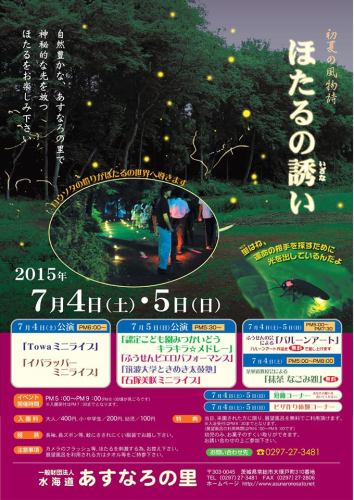 本日から常総市の「水海道あすなろの里」で開催の「ほたるの誘い」♪明日のステージイベントに19:00~Vo.石塚美咲、Gt.下田雄人で出演させていただきます(^^*)Live音源が入った無料CD「VOl.5」も限定50枚お配りいたします♪雨天時は食堂にてイベントを行います♪丁度Liveが終わった20時ごろが蛍の見頃だそうです(^^*)虫に刺されないように長袖長ズボンでお越し下さい♪また、バスタオル持参で入浴も可能ですよ(°▽°)!詳しくはポスターまたはあすなろの里HPをご覧ください♪楽しみだなぁ~(´ω`*)☆美咲スケジュール☆◆7/5(日)19:00~常総市あすなろの里「ほたるの誘い」大人400円、小中学生200円Vo.石塚 美咲 Gt.下田雄人 ※雨天時食堂にてLive◆7/18(土)筑西市イーヴィルガレージVo.Pf.石塚美咲 Ds.古谷野雄多※詳細は後程◇「神保シェフと茨城をたべよう」6月分【Youtube】on-air! FM84.2ラヂオつくば毎週火曜日23:00~「石塚美咲と唄種ラヂオ」 番組宛てメッセージはこちら※ネットでのご視聴はサイマルラジオから♪石塚美咲ミニアルバム「Crescendo」<配信先>iTunes Amazon1stフルアルバム「Tout de moi」 10曲配信中!「iTunes」 「mora」<着うた>「レコチョク」 「TSUTAYAプレミア」 「GIGA MUSIC」 「mu-mo」 「music.jp」無料メルマガ「misaki's mail」会員さま募集!美咲Live映像「YouTube」出演依頼:Voice Presenterまでお問い合わせお願い致します。 ※ナレーションのご依頼もお待ちしております。