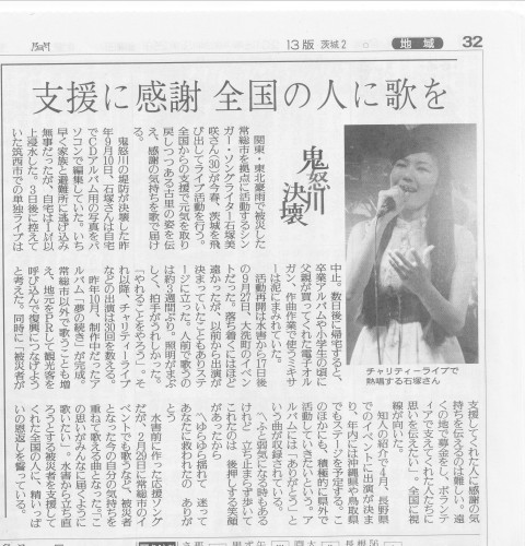 以前から水害後の活動について取材をして頂いておりその記事が読売新聞さんに3/25掲載されました(^^)3/31〆切の義援金へのご協力の最後のお願いをしながらご支援いただきました皆様に感謝をお伝えしていければと思ってます♪日頃より応援してくださる皆様本当にありがとうございます!そして、同じ日…。私の作業部屋の床下は土はなのですが、グレイスシティーリリーフのボランティアの皆さんと一緒に約15センチ床下の土を撤去しました★今まで途方もない作業を前に全くやる気が起きなかったのですが11名のボランティアさんのお陰で1日で撤去作業が終わりました!これで、ニオイの元となる水害の時に入った泥もきっと無くなったことでしょう!本当に助かりました( > < )!!コンクリートを流す予定でいますが、資金調達が難しいので…暫く放置かもしれません。。。そして…茨城県の最終回義援金が発表されました!大規模半壊の我が家は11万6000円頂けるそうです( > < )床上浸水の方も同じ金額です。茨城県の義援金にご協力下さいました皆様本当にありがとうございます!引き続き、3/31まで、常総市への義援金のご協力をお願い致します(。>ω<。)________石塚美咲復興支援CD「夢の続き」の製作費を除く売上の半分434円は●2015年11月~12月末日57,330円分は「常総名産会いしこら倶楽部」パンフレット再版費として寄付させていただきます。●2016年1月~3月28日までは常総市義援金へ当てさせていただきます。3月21日現在80枚34,720円。+ライブで募った義援金11,000円。合計45,720円。 ●被災店舗にて設置販売のCDにつきましては1枚に付き500円を被災店舗へ寄付させていただきます。________私は、大きな損害を受けた常総市が今後しっかりと再建するには皆様からの支援が途絶えた後に自立して行けることが不可欠だと考えます。私の活動規模で、何が出来るか考えた時この常総市の名産を多くの方に知っていただき購入していただくことが、後の常総市を支えてくれる大きな資源になると感じました。●石塚美咲復興支援CD「夢の続き」御注文・詳細はこちらです。●YoutubeにてSample音源を公開しています。●常総市では義援金を2016/3/31まで受付しております。☆美咲スケジュール☆ ●3/26(土)11:40~27(日)12:00~「茨城クラフトフェア(10:00~15:00)」観覧無料Vo.Pf.石塚美咲 Dr.古谷野雄多(天候によりCDオケ)<下館総合体育館>茨城県筑西市上平塚627●4/10(日)12:00「常総市千姫まつり」観覧無料Vo.石塚美咲 Gt.Takahiro Nakajima Perc.古谷野雄多●4//24(日)16:30~石塚美咲ソロライブ「Lilly bell」Charge1,500円(1dr付)予約:029-898-9019Vo.Pf.石塚美咲<クラウドナイン>茨城県つくば市 茨城県つくば市大角豆945◇「神保シェフと茨城をたべよう」 毎月16日更新!【Youtube】on-air!FM84.2ラヂオつくば 毎週火曜日23:00~「石塚美咲と唄種ラヂオ」 番組宛てメッセージはこちら※ネットでのご視聴はサイマルラジオから♪復興支援CD「夢の続き」4曲入り 1,000円(税込)送料[無料]にて郵送いたします。詳細・ご注文詳はこちら。●YoutubeにてSample音源を公開しています。石塚美咲ミニアルバム「Crescendo」<配信先>iTunes Amazon1stフルアルバム「Tout de moi」 10曲配信中!<配信先>iTunes mora<着うた>レコチョク TSUTAYAプレミア GIGA MUSIC mu-mo music.jp無料メルマガ「misaki's mail」会員さま募集!美咲Live映像「YouTube」出演依頼:Voice Presenterまでお問い合わせお願い致します。