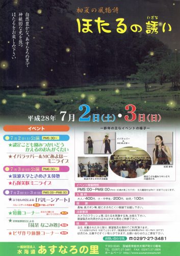 今年もやってまいりました!初夏の風物詩「ほたるの誘い」(*'▽')!私は3(日)に出演いたします(^^)/今年で出演も3回目☆ほたると、皆さんに会えることを楽しみにしています♪ポスターを載せますね(*^^)v場所:水海道あすなろの里常総市大塚戸町310(0297-27-3481)イベント開催時間:17:00~21:00入園料:大人400円 小中学生200円 幼児100円特典:当日来園された方に限り露天風呂無料!(タオル持参)長袖、長ズボン等、蚊に刺されにくい服装でお越しください(*‘∀‘)自然豊かなあすなろの里で初夏をお楽しみください♪そして、あすなろの里は昨年9月の水害の際多くの方が避難所として利用してお風呂無料開放なども行ってくださいました。職員の皆様、関係者の皆様、ボランティアの皆様大変なご苦労があったと思います。感謝の気持ちを込めて、門をくぐりたいと思います(*^^)皆様、あすなろの里でお会いいたしましょう♡ **********石塚美咲復興支援CD「夢の続き」の製作費を除く売上の半分434円は●2015年11月~12月末日57,330円分は「常総名産会いしこら倶楽部」パンフレット再版費として寄付させていただきます。印刷は被災した市内の岩見印刷にて行います。●2016年1月~は常総市義援金へ当てさせていただきます。・1月~3月まで89枚38,626円。常総市義援金募金26,175円。合計64,801円。・4月は18枚7,812円。常総市義援金募金3,457円。合計11,269円。・5月はCD、募金ともに0円。6月はCD20枚、募金0円、合計8,680円。 ●被災店舗にて設置販売のCDにつきましては1枚に付き500円を被災店舗へ寄付させていただきます。________私は、大きな損害を受けた常総市が今後しっかりと再建するには皆様からの支援が途絶えた後に自立して行けることが不可欠だと考えます。私の活動規模で、何が出来るか考えた時この常総市の名産を多くの方に知っていただき購入していただくことが、後の常総市を支えてくれる大きな資源になると感じました。●常総市では義援金を2017/3/31まで受付しております。**********☆美咲スケジュール☆ 7/2(土)栃木県那須塩原市「湧花庵」7/3(日)常総市大塚戸「あすなろの里」ほたるの誘いVo.Pf.石塚美咲 Perc.古谷野雄多7/27(水)かうひいや珈和「珈琲日和」無料 ◇「神保シェフと茨城をたべよう」 毎月16日更新!【Youtube】on-air!FM84.2ラヂオつくば 毎週火曜日23:00~「石塚美咲と唄種ラヂオ」 番組宛てメッセージはこちら※ネットでのご視聴はサイマルラジオから♪復興支援CD「夢の続き」4曲入り 1,000円(税込)普通郵便にて郵送。送料200円~詳細・ご注文詳はこちら。●YoutubeにてSample音源を公開しています。石塚美咲ミニアルバム「Crescendo」<配信先>iTunes Amazon1stフルアルバム「Tout de moi」 10曲配信中!<配信先>iTunes mora<着うた>レコチョク TSUTAYAプレミア GIGA MUSIC mu-mo music.jp無料メルマガ「misaki's mail」会員さま募集!美咲Live映像「YouTube」出演依頼:Voice Presenterまでお問い合わせお願い致します。