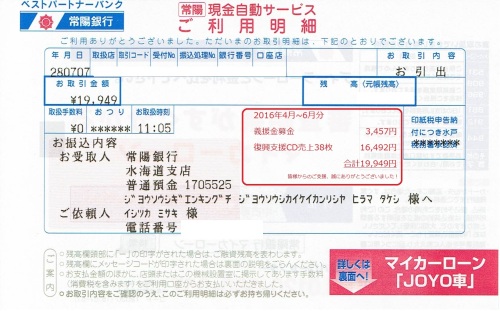 今日は選挙の投票日ですね(*^^*)常総市の市長選で候補者の皆さんが公約に「水害からの復興」を掲げていることからも常総市が未だ復興半ばだということがとても良く分かります。「復興財源」私もできる範囲で、被災者の皆さんに義援金が届くように4月~6月分の募金3,457円と復興支援CD売上の半分16,492円(38枚×434円)合計19,949円を常総市義援金口に振込してきました(*'▽')これも、ご協力くださいました皆様のお陰です。皆様から頂きましたお気持ちを被災者で分け合えることを大変ありがたく思います。 また、床上110cmの水害に見舞われた私自身が皆様からの「義援金」のありがたみと必要性を強く感じているが故、この活動を続けています。まだ、自宅は修繕できていませんがそれでも売上を寄付をするのは支援の輪が広がれば幸いと思っているからです。少しでも、失った財産を取り戻せますように。常総市の義援金受付は2017年3月末日までです。引き続き、ご支援賜りますよう心からお願い申し上げます。参考までに、2016年1~3月までの募金&復興支援CD売上分を常総市義援金として寄付した際の寄付金受領証明書です。※お礼状もいただいております。1月~3月まで89枚38,626円。常総市義援金募金26,175円。合計64,801円。2015年11月~12月末日復興支援CD売上の半分57,330円は「常総名産会いしこら倶楽部」様パンフレット再版費として寄付。※お礼状もいただいております。印刷は被災した市内の岩見印刷様にて行いました。再版したパンフレットはライブ会場にてお配りしております。ご協力下さいました皆様、本当にありがとうございます!!**********石塚美咲復興支援CD「夢の続き」の製作費を除く売上の半分434円は●2015年11月~12月末日57,330円分は「常総名産会いしこら倶楽部」の水没したパンフレット再版費として寄付。印刷は被災した市内の岩見印刷にて行いました。●2016年1月~は常総市義援金へ当てさせていただきます。・1月~3月まで89枚38,626円。常総市義援金募金26,175円。合計64,801円。・4月~6月まで38枚16,492円。常総市義援金募金3,457円。合計19,949円。 ●被災店舗にて設置販売のCDにつきましては1枚に付き500円を被災店舗へ寄付。________私は、大きな損害を受けた常総市が今後しっかりと再建するには皆様からの支援が途絶えた後に自立して行けることが不可欠だと考えます。私の活動規模で、何が出来るか考えた時この常総市の名産を多くの方に知っていただき購入していただくことが、後の常総市を支えてくれる大きな資源になると感じました。●常総市では義援金を2017/3/31まで受付しております。**********☆美咲スケジュール☆ ◆7/18(月・祝)こもれび森のイバライドLive◆7/27(水)14:00~かうひいや珈和「珈琲日和」無料 ◇「神保シェフと茨城をたべよう」 毎月16日更新!【Youtube】on-air!FM84.2ラヂオつくば 毎週火曜日23:00~「石塚美咲と唄種ラヂオ」 番組宛てメッセージはこちら※ネットでのご視聴はサイマルラジオから♪復興支援CD「夢の続き」4曲入り 1,000円(税込)普通郵便にて郵送。送料200円~詳細・ご注文詳はこちら。●YoutubeにてSample音源を公開しています。石塚美咲ミニアルバム「Crescendo」<配信先>iTunes Amazon1stフルアルバム「Tout de moi」 10曲配信中!<配信先>iTunes mora<着うた>レコチョク TSUTAYAプレミア GIGA MUSIC mu-mo music.jp無料メルマガ「misaki's mail」会員さま募集!美咲Live映像「YouTube」出演依頼:Voice Presenterまでお問い合わせお願い致します。