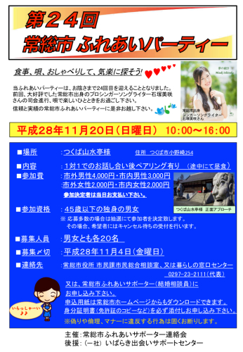 先日の日曜日はつくば山水亭さんで開催された第24回常総市ふれあいパーティーの司会進行とカップリング照合中のLIVEを担当いたしました(*´▽`*)今年の2月に引き続きのオファーをいただき、ポスターにも記載してくださり大変うれしいです(∩´∀`)∩常総市からの補助金を活用し開催されているためとってもお得に素敵な出会いを探すことができます(*´ω`*)市外男性は4,000円、市内男性は3,000円☆女性は市外・市内ともに2,000円の参加費ですがつくば山水亭さんのお料理は 3,000円相当です(*^^)vさらに、飲み物代も入れれば4,000円相当になるでしょう♪ちなみに。。。こちらはスタッフ用のお弁当のため、参加者の皆さんが召し上がったお弁当よりランクが下がりますがとっても美味しくて完食(●´ω`●)♡そして、お弁当の写真しか撮っていなかったという…w今回は6組のカップルが誕生しました(∩´∀`)∩有り難いことに、婚活の司会も今年は4回目(*^^*)参加者の皆さんの緊張が解けるように楽しく司会進行をして、出会いのお手伝いができるように心がけてます(^^)/そして、、、常総ふるさと大使としてライブの時間に12/18に司会&LIVEで出演する圏央道常総ICで開催の「ぎょうかいウォッチ/常総ハイウェイウォーク」の宣伝もしましたよ(*´ω`*)昨年は水害で中止になった「ぎょうかいウォッチ」★今年は1年越しの開催です(*^-^*)そして、いよいよ完成する常総IC!便利になると、移動時間の短縮になって有り難いですね♪開通前に、高速道路を歩きましょ(^^)/話は戻って。。。常総市の出会いサポートは登録無料です(*´ω`*)市外の方でも登録できますのでこちらからご確認ください(^^)/http://www.city.joso.lg.jp/ikkrwebBrowse/material/files/group/38/kouhou2807_0203.pdf関係者の皆様、引き続きお世話になります(*´ω`*)そして、応援して下さる皆様、誠にありがとうございます♪ *****INFO*****石塚美咲復興支援CD「夢の続き」の製作費を除く売上の半分434円は●2015年10月~12月末日57,330円分は「常総名産会いしこら倶楽部」の水没したパンフレット再版費として寄付。印刷は被災した市内の岩見印刷にて行いました。●2016年1月~は常総市義援金へ充てさせていただきます。・1月~3月まで89枚38,626円。常総市義援金募金26,175円。合計64,801円。・4月~6月まで38枚16,492円。常総市義援金募金3,457円。合計19,949円。・7~9月分合計101枚43,834円、義援金募金6,626円。合計50,460円 ●被災店舗にて設置販売のCDにつきましては1枚に付き500円を被災店舗へ寄付。________私は、大きな損害を受けた常総市が今後しっかりと再建するには皆様からの支援が途絶えた後に自立して行けることが不可欠だと考えます。私の活動規模で、何が出来るか考えた時この常総市の名産を多くの方に知っていただき購入していただくことが、後の常総市を支えてくれる大きな資源になると感じました。●常総市では義援金を2017/3/31まで受付しております。引き続き、ご支援をいただきますよう、よろしくお願いいたします。**********☆美咲スケジュール☆【◆=LIVE ◇=司会】◆11/30(水)14:00~常総市かうひいや珈和「珈琲日和」無料 Live◆◇12/4(日)鳥取県米子「フラハラウ ピカケテルヌマ Ho'ike2016」司会&歌 出演◆◇12/11(日)沖縄県那覇市「フラハラウ ピカケテルヌマ Ho'ike2016」司会&歌 出演◆12/24(土)19:00~筑西市イーヴィルガレージ「Xmas LIVE」1,500円プレゼント付☆ ◇「神保シェフと茨城をたべよう」 毎月16日更新!【Youtube】on-air!FM84.2ラヂオつくば 毎週火曜日23:00~「石塚美咲と唄種ラヂオ」 番組宛てメッセージはこちら※ネットでのご視聴はサイマルラジオから♪復興支援CD「夢の続き」4曲入り 1,000円(税込)普通郵便にて郵送。送料200円~詳細・ご注文詳はこちら。●YoutubeにてSample音源を公開しています。石塚美咲ミニアルバム「Crescendo」<配信先>iTunes Amazon1stフルアルバム「Tout de moi」 10曲配信中!<配信先>iTunes mora<着うた>レコチョク TSUTAYAプレミア GIGA MUSIC mu-mo music.jp美咲Live映像「YouTube」出演依頼:Voice Presenterまでお問い合わせお願い致します。